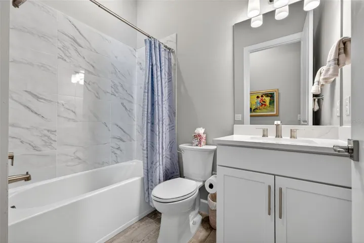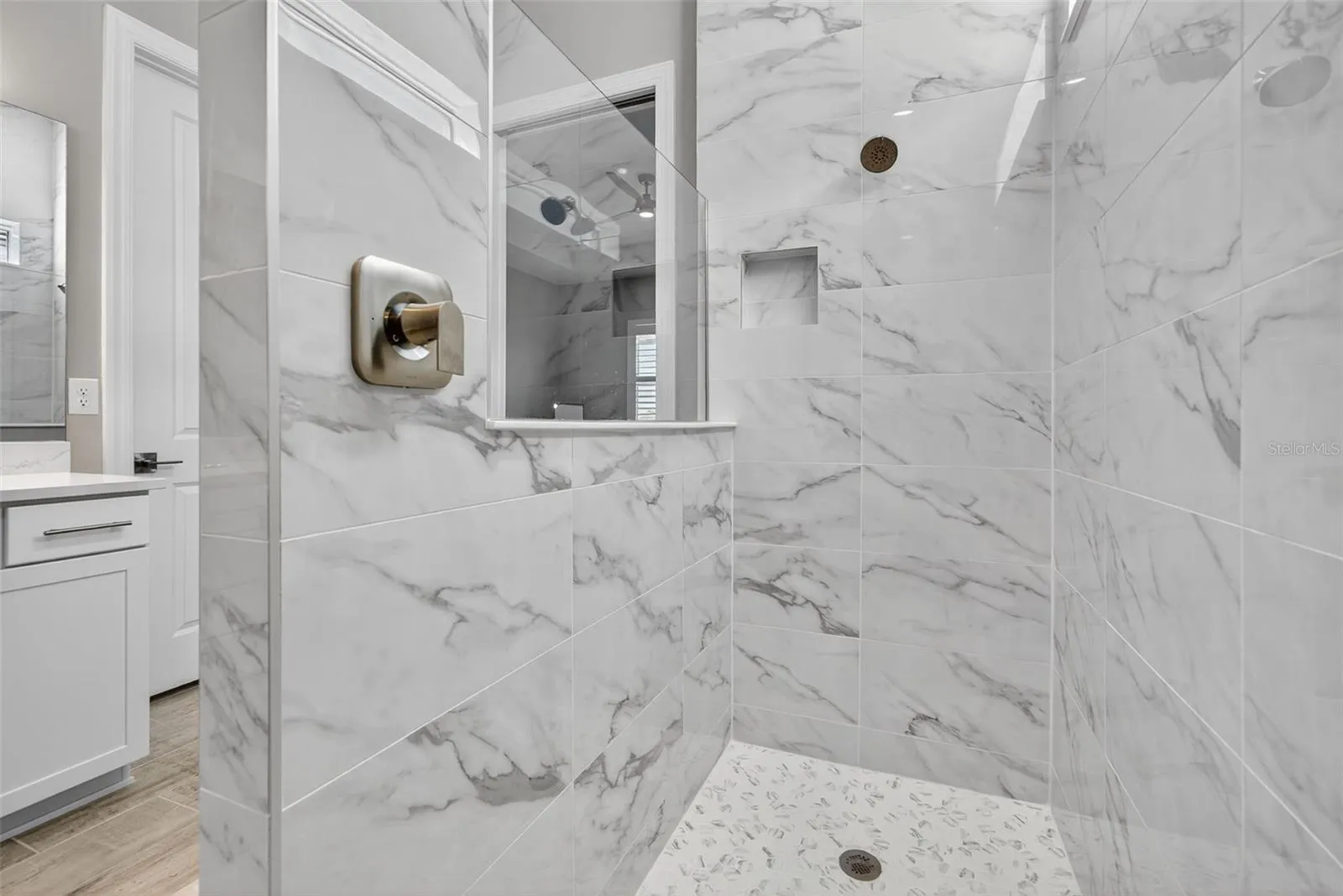 The DINING AREA overlooks the SCREENED LANAI overlooking sparkling POOL AND SPA allowing seamless indoor-outdoor living. Enjoy morning coffee or evening cocktails while taking in the peaceful surroundings. The OWNER’S SUITE is a true retreat, featuring a LUXURIOUS ENSUITE BATHROOM with DUAL VANITIES, QUARTZ COUNTERS, a WALK-IN SHOWER WITH FRAMELESS GLASS, and an EXPANSIVE WALK-IN CLOSET.
