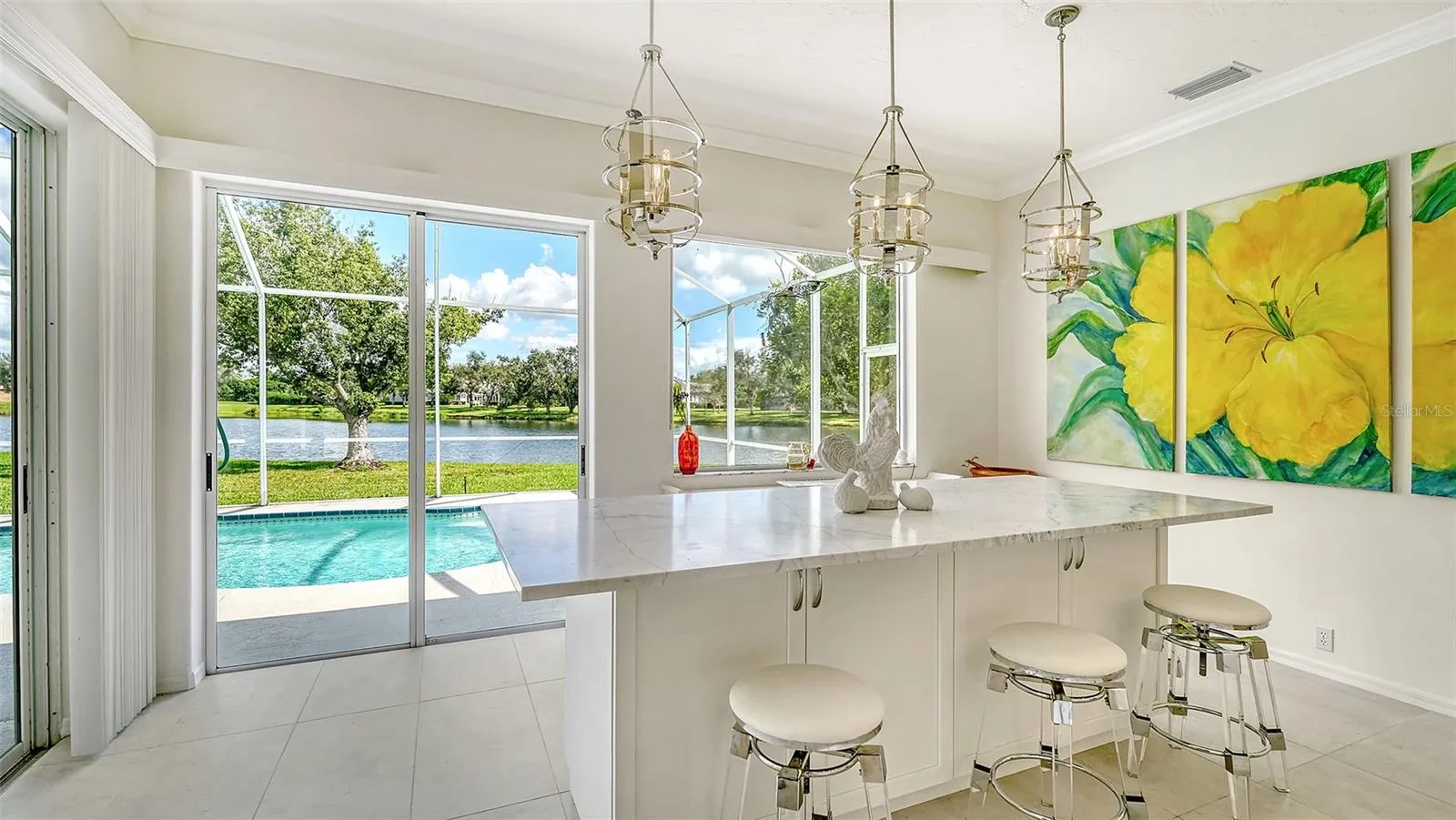 Laurel Oak Estates, beautiful lakefront home featuring a three-bedroom, two-bath home with a den and open floor plan. Gourmet kitchen with granite counters, white cabinetry and a large island for entertaining. Enjoy the screened-in and covered patio with an eastern exposure, as well as a large swimming pool overlooking the lake. Features include updated finishes, natural light and a two-car side entry garage. Convenient location near shopping, dining and top-rated schools. Membership to Laurel Oak Country Club is optional, which features two championship golf courses, Har-Tru tennis courts and pickleball. Active social membership for casual and fine dining. Reciprocal to Bird Key Yacht Club. Move-in ready and ideal for Florida living. Come live the lifestyle.