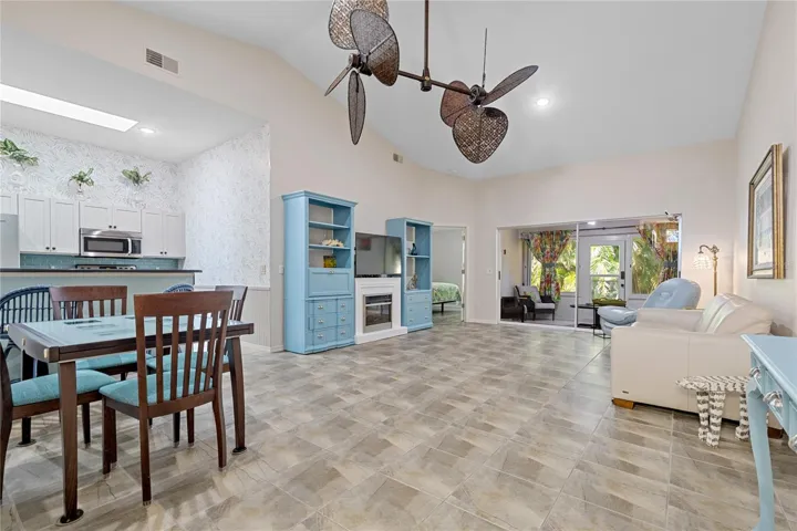 This open floor plan features vaulted ceilings, tile flooring throughout the main living areas, skylights for plenty of natural light. The spacious beautifully updated kitchen opens to the dining and living area, making it perfect for entertaining guests. Kitchen has plenty of cabinet space and a breakfast bar, ideal for all of you cooking and entertaining needs. The primary suite includes a walk-in closet and en-suite bath, while the split floorplan provides privacy for the guest bedroom and bath to visitors.