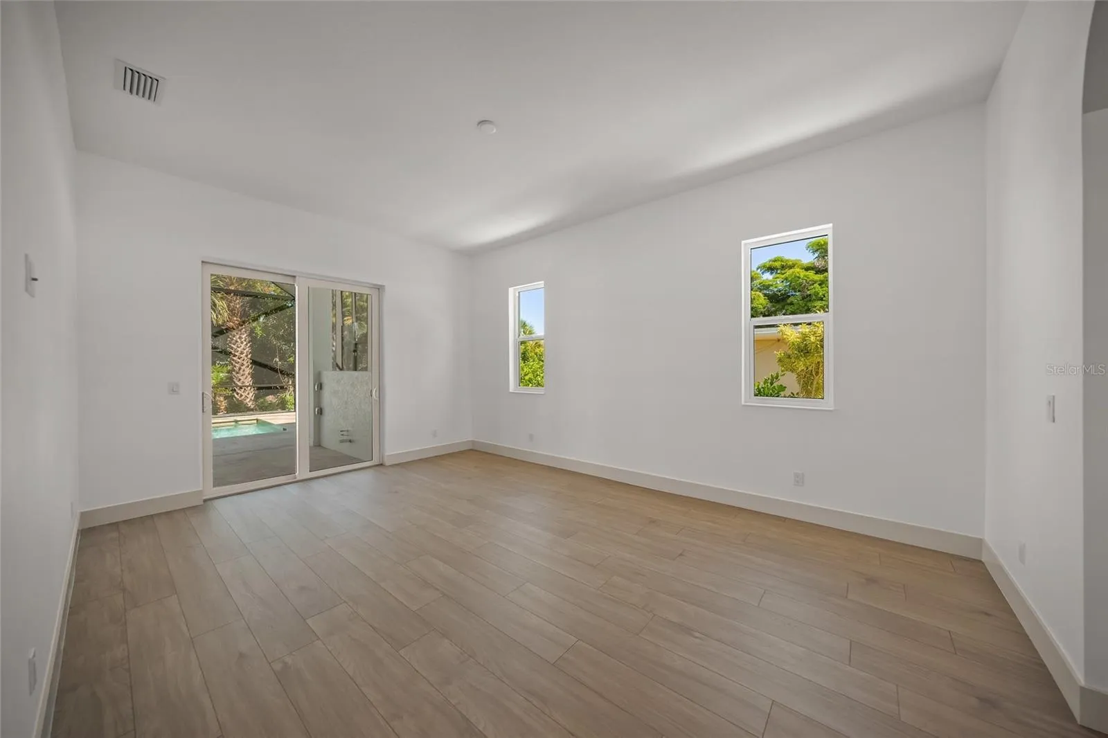 Outside, the private outdoor oasis features a saltwater pool with pebble sheen finish, waterfall feature and sun shelf, Travertine tile decking, No-See-Um high-density screened cage, and an outdoor kitchen rough-in—ready to be your dream entertaining space.