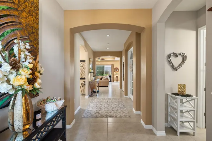 A must see beautiful home in the gated community of Entrada in Cape Coral. With low HOA fee, No CDD, low taxes and insurance and all the resort style amenities possible to live the sought after Florida lifestyle. This Impressive and stunning Wheaton floor plan home is perfectly positioned on a sweeping corner lot. Over 2,500 square feet of well designed living space featuring 3 bedrooms plus a den, 3.5 bathrooms, and a 3 car garage. Surrounded by lush, custom Florida landscaping, the oversized backyard provides plenty of room to add a pool and create your own private paradise. The grand foyer welcomes you into a bright and airy great room that seamlessly connects the living, dining, and kitchen areas. The huge kitchen is a showstopper with a massive center island, granite countertops, stainless steel appliances, stylish backsplash, soft close cabinetry, and an oversized, walk-in pantry. Each bedroom offers privacy with its own bath, while the primary suite is a true retreat featuring a spa-like walk-in shower, dual vanities, and 2 walk-in closets. Outside provides a screened lanai and an extended paver patio, the perfect place for morning coffee and sunset gatherings in the tranquility of your private backyard. Additional highlights in this home include tile flooring throughout the main living areas, carpet in the bedrooms, new lighting & ceiling fans, a large laundry room with sink, Hurricane shutters for peace of mind and Smart home technology that control locks, garage, and lighting from your phone! Enjoy Entrada’s resort-style amenities, including a massive sparkling pool, clubhouse, tennis & pickleball courts, play area, and more, all in a golf cart–friendly community. This home checks every box for space, style, and value. Schedule your private tour today and discover why Entrada is one of Cape Coral’s premier places to live!