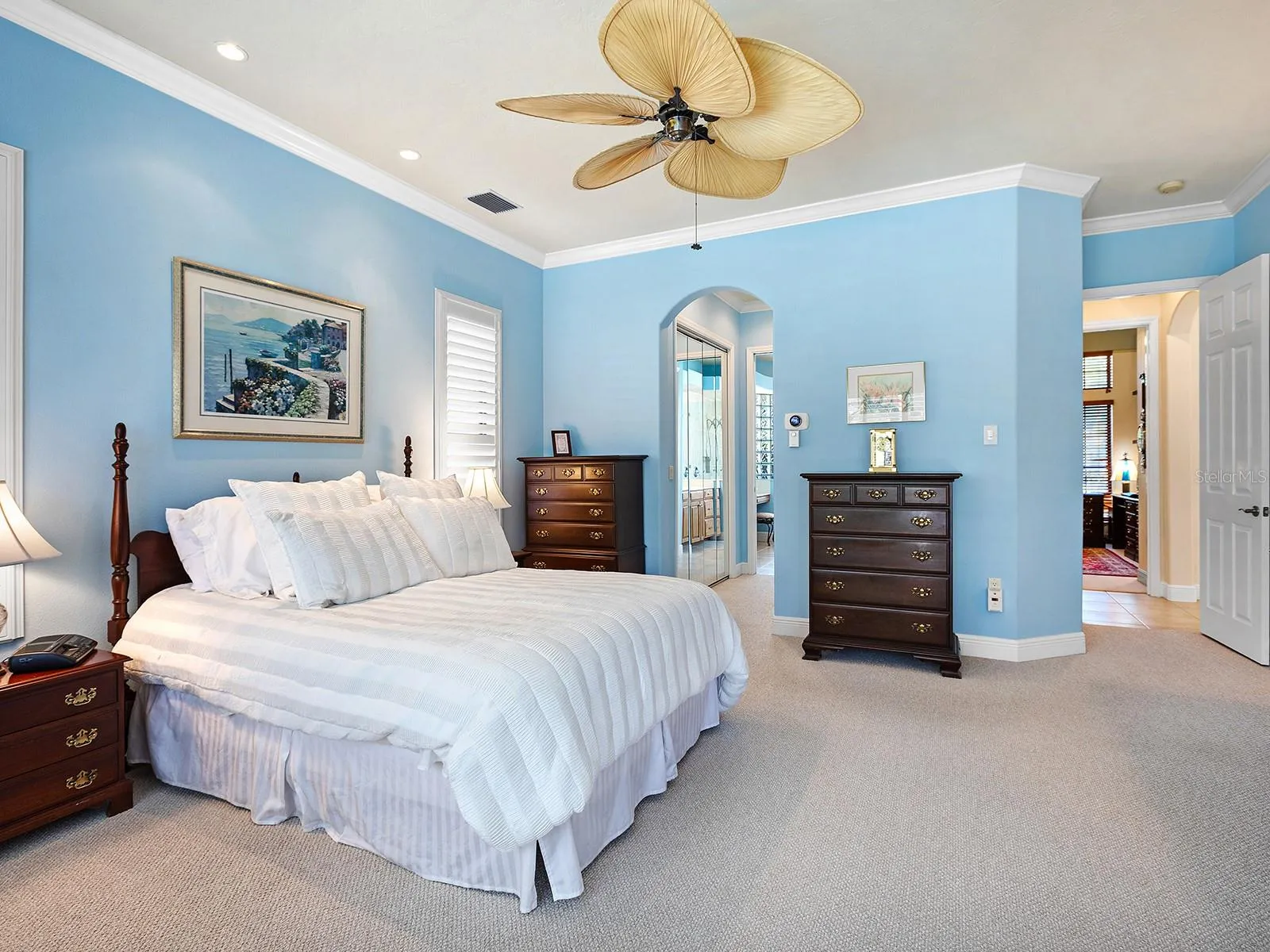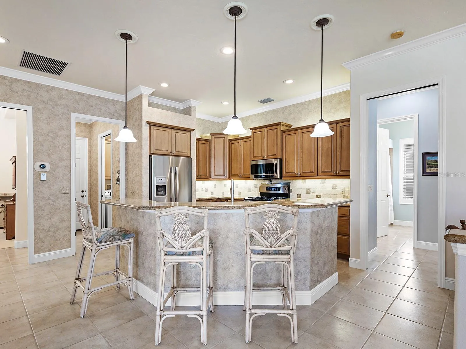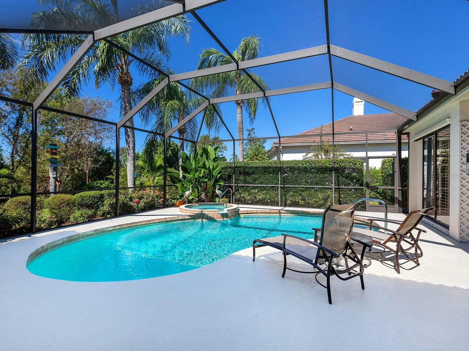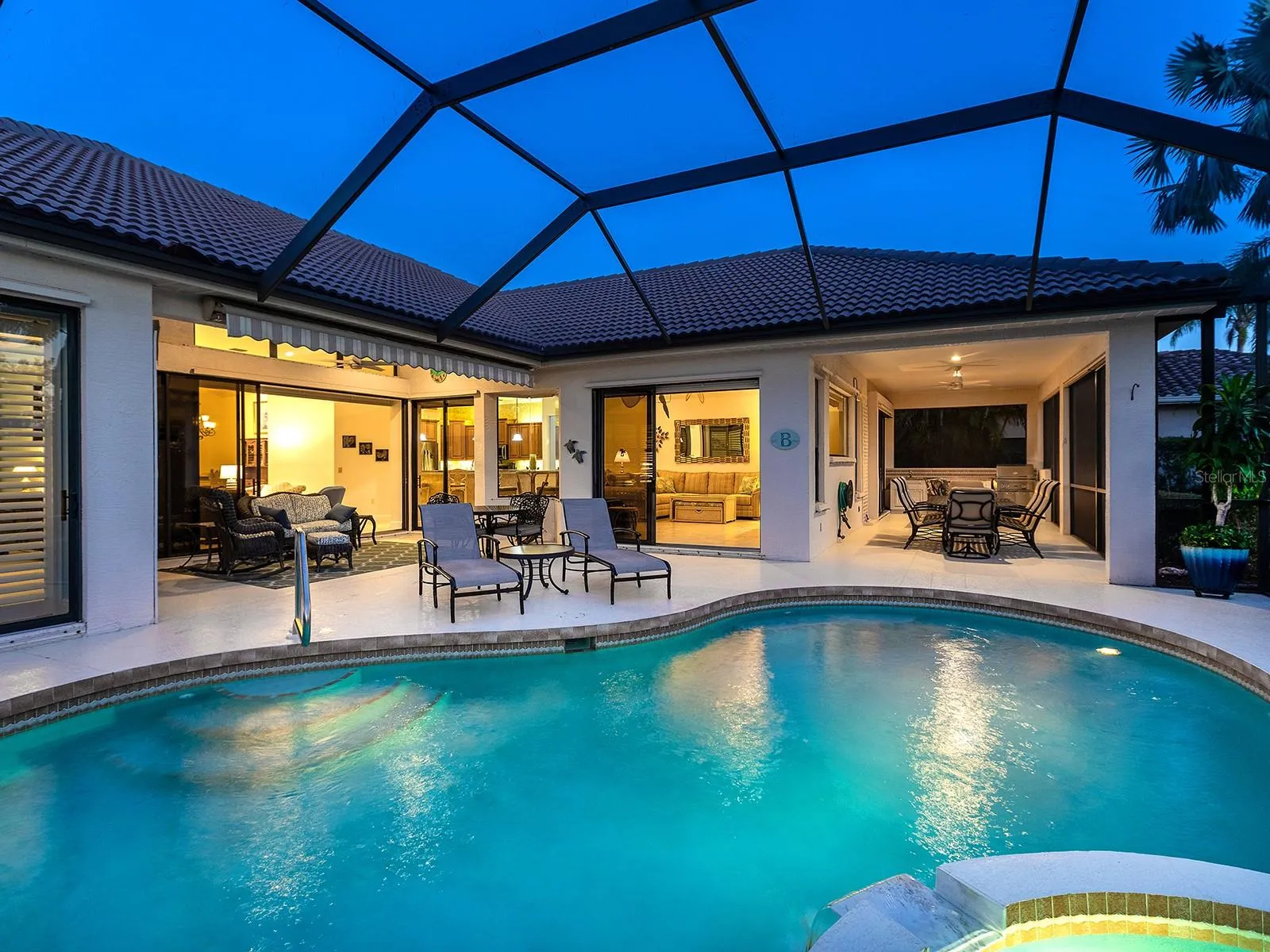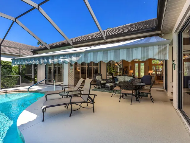 Set on a beautifully landscaped homesite within the gates of Lakewood Ranch Country Club, this meticulously maintained residence offers a NEW tile roof (2025) plus 3 beds and 3 full baths. The home makes an elegant impression with its oversized paver driveway, gorgeous landscaping, with lighting. A 3-car garage and a paver walkway leading to the glass-detailed front doors complete the approach. The foyer welcomes you with crown molding, a chandelier, and ceramic tile floors, introducing a layout designed for both comfort and entertaining. The living room features pocketing sliders topped with transom windows, flooding the space with natural light. The adjoining dining room offers a defined setting, complete with a niche for a credenza, plantation-shuttered windows, and a pony wall with a column accent. The kitchen is a highlight of the home, spacious, functional, and thoughtfully designed with abundant solid-wood cabinetry, a large bar-height counter with granite top, and a coordinating dry bar featuring glass display cabinets, tumbled-stone backsplash, and accent lighting above and below. Stainless-steel appliances include a Frigidaire gas range, Samsung microwave, Whirlpool refrigerator, and a newer stainless apron sink. Additional features include a workspace area with a granite countertop, a hallway pantry, and an aquarium window framing the breakfast nook. Open to the kitchen, the family room provides an ideal gathering space with custom ceilings, built-in speakers, crown molding, and custom built-ins with bench seating on either side of the media wall. The functional floor plan ensures privacy for all. The primary suite is an expansive retreat featuring two sets of pocketing sliders to the lanai, plantation shutters throughout, a generous seating area, a walk-in closet and a wall closet, each outfitted with built-ins. The en-suite bath includes dual vanities (one with a makeup area), a sunken tub set beneath a glass-block privacy window, a walk-in shower with seamless glass, tile flooring, a private water closet, and a drop-down soffit ceiling detail. Two additional guest rooms offer comfort. One is designed as a guest suite with direct lanai access, a custom closet, and a stunningly remodeled en-suite bath featuring a designer lighted mirror, walk-in shower with bench seating, and a linen cabinet. The other guest bedroom is complete with a wall-to-wall shelf and a spacious closet, located near a well-appointed full bath. The guest full bath includes a spacious vanity with solid-surface counters and a tub/shower combination. A separate office with built-in floating shelves, detailed trim, and a full closet allows for use as a fourth bedroom if desired. Outside, the expansive screened lanai features a cool-deck surface, remote-controlled awning, two covered seating areas for dining and lounging, and ceiling fans, the space overlooks a sparkling pool and spa. The outdoor kitchen includes a refrigerator, sink, and grill area, while lush tropical landscaping frames the backyard and provides a sense of privacy. The lanai comes complete with a large dining table and eight chairs, a premium Lynx grill, and both the family room and primary bedroom televisions are included in the sale, with most other furnishings negotiable. Lakewood Ranch Golf & Country Club offers premier golf, diverse memberships, and a prime location near Waterside, UTC, dining, shopping, and world-class beaches.