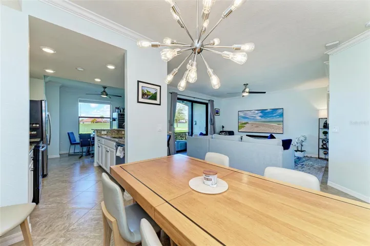 The spacious family room features stunning views of the first hole on the Arnold Palmer–designed championship golf course. The kitchen is a chef’s delight, showcasing updated cabinetry, granite countertops, an eat-in bar, a cozy kitchenette area, and ample storage—perfect for both casual dining and entertaining. A separate formal dining room sits adjacent, offering the ideal setting for hosting family and friends.