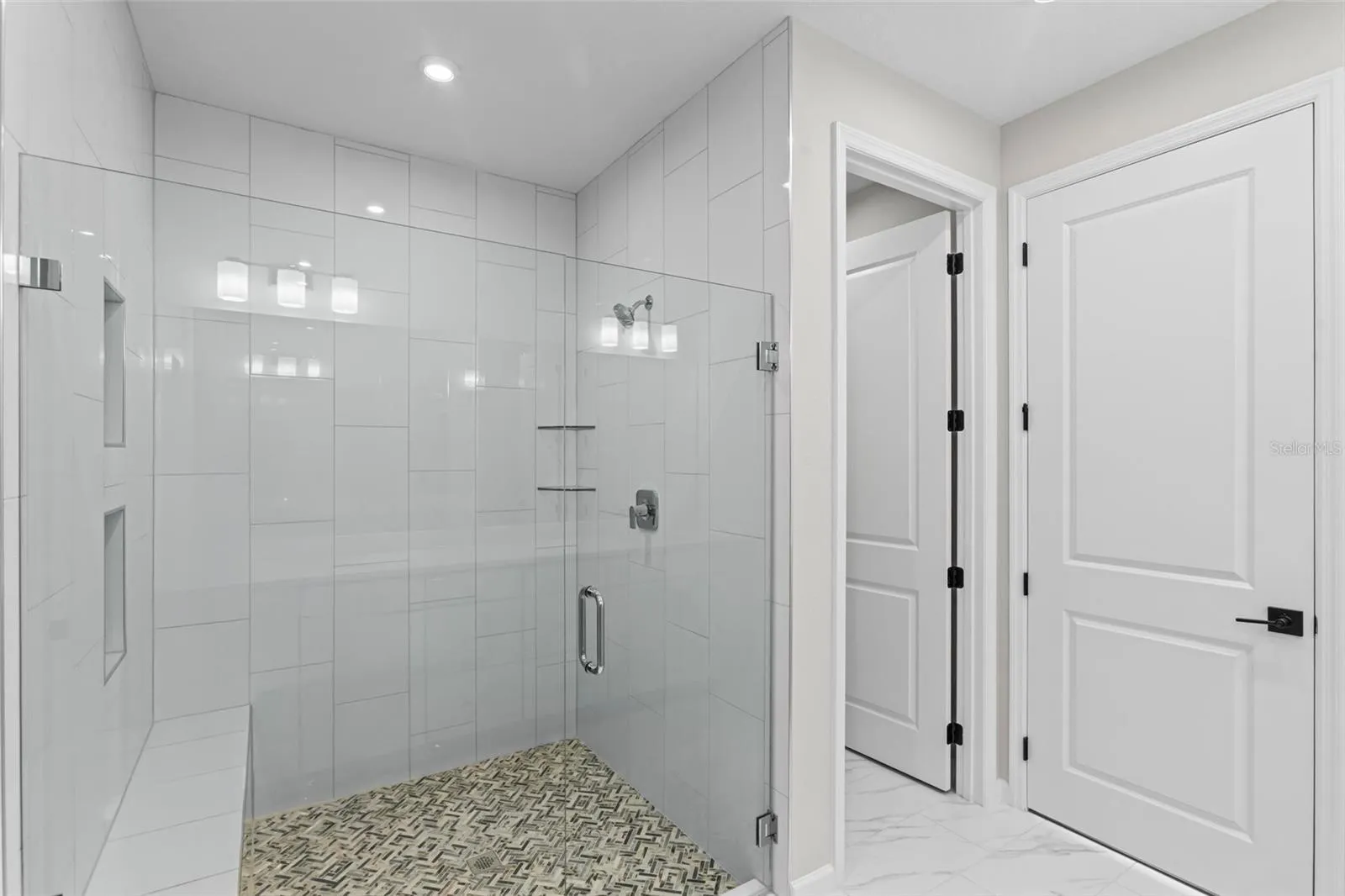 The Owner’s Suite is a true retreat, featuring a luxurious extended shower with a frameless glass enclosure, upgraded stone mosaic tile flooring, and both a standard and handheld showerhead with a slide bar. All bathrooms include upgraded plumbing fixtures and tile that extends to the ceiling, providing a spa-like atmosphere. The home’s main living areas are finished with elegant 12×24 porcelain tile, while the Owner’s Suite and flex space feature stylish laminate plank wood flooring for warmth and durability.