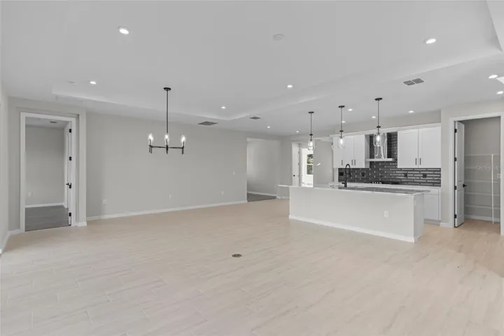 The centerpiece of the home is the gourmet kitchen, crafted for both functionality and elegance. Enjoy preparing meals with premium stainless steel appliances, including a wall oven, gas cooktop, and an efficient chimney-style exhaust hood. Frameless European-style cabinetry with upgraded large crown molding offers abundant storage and a contemporary look, while the 24” deep cabinet above the refrigerator with a side panel provides extra convenience. The kitchen is adorned with stunning 3cm luxury veined quartz countertops and an artisan tile backsplash, perfect for both daily living and entertaining guests.