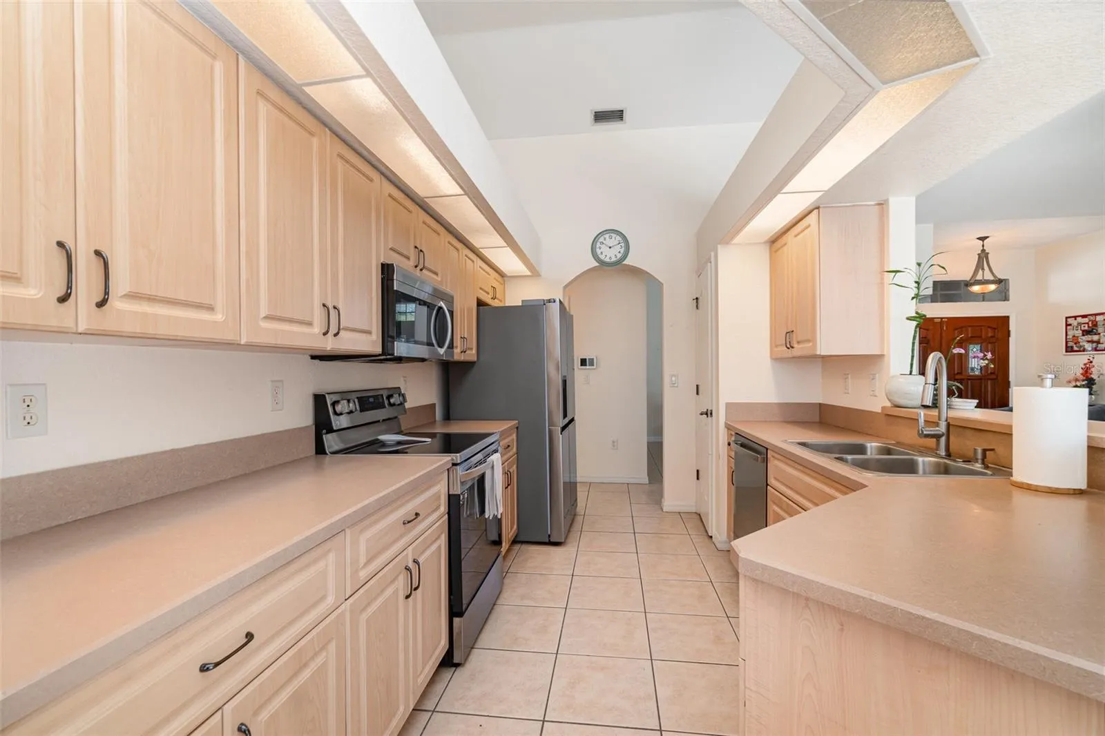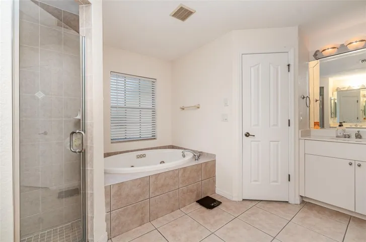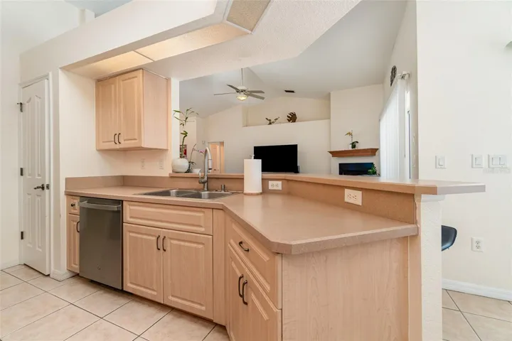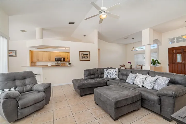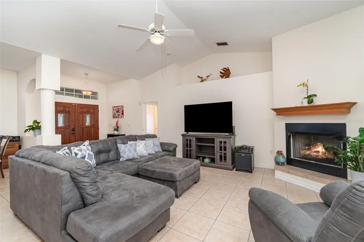 Step inside to find an open, split-bedroom floor plan that’s ideal for entertaining. The living room welcomes you with soaring ceilings and a cozy gas fireplace. Enjoy tile flooring throughout the main areas with carpeted bedrooms for added comfort. The spacious master suite features sliding doors to the pool, a canal view, walk-in closet, dual sinks, and a luxurious garden tub.