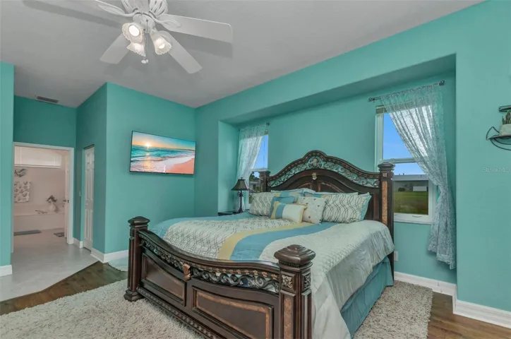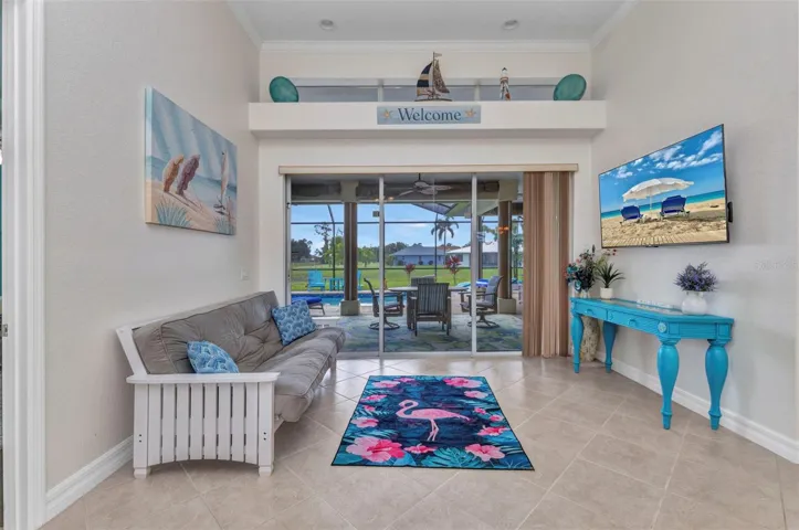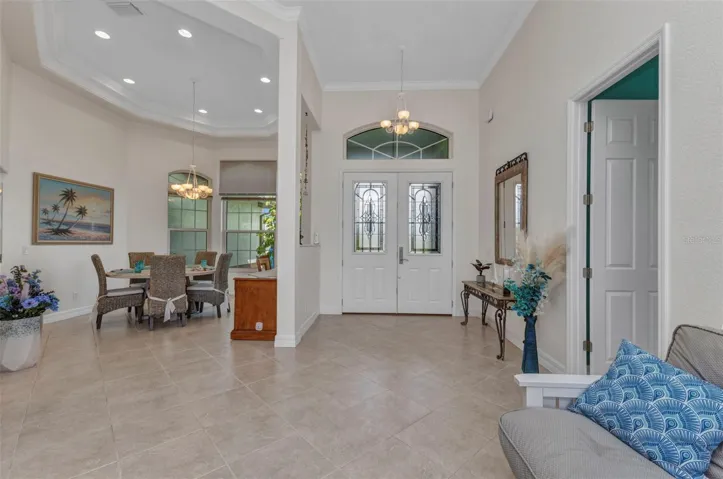 The layout of this home flows nicely, and from the moment you enter the front door you will be immediately presented with the vast views through the formal living room and into the lanai and beyond! On the left of the home you will find your primary bedroom suite with an oversized bedroom, two large walk-in closest, and a spacious bathroom with a convenient fan to help keep you cool while getting ready. Continuing to the right of the home you will find an area at the front of the home perfect for a formal dining room or office space. Beyond that you enter into the large kitchen with crown molding, plenty of cabinets, quartz countertops, and quite spacious family room, both with grand views of the lanai and into the community. Finally on the right side of this spectacular home you will find your two bedrooms, second full bathroom, and laundry room with exterior door leading to the garage.