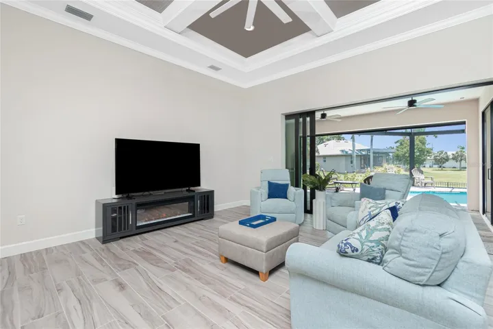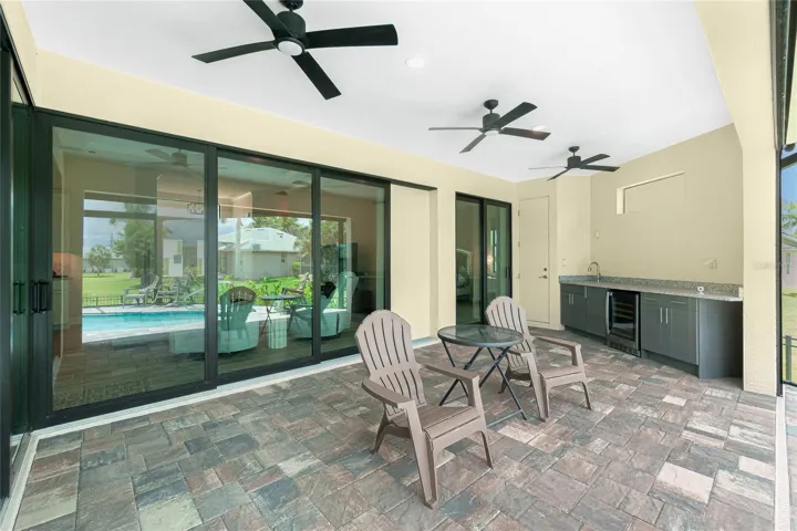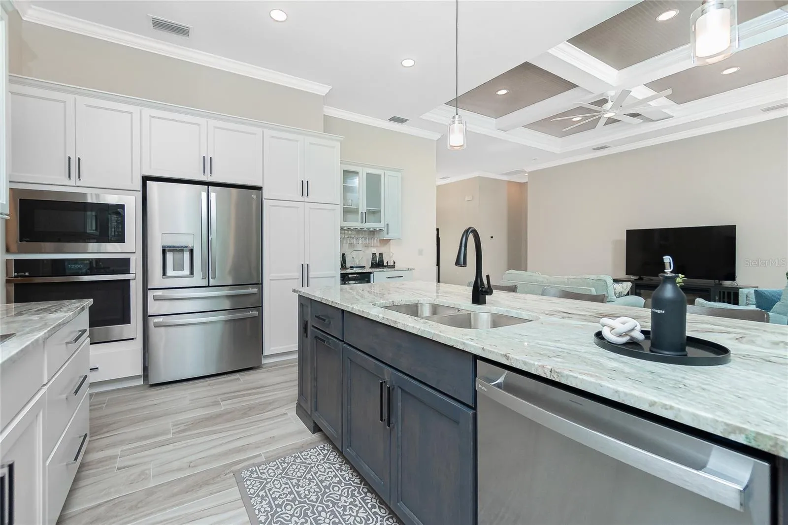 Step into this elegant residence as you are greeted by an open-concept layout, seamlessly blending indoor and outdoor living, with zero corner sliding glass doors. Expansive windows bathe the home in natural light. Fine details abound, from soaring coffered ceilings and custom millwork, to a chef-inspired kitchen outfitted with top-of-the-line appliances, granite countertops, a spacious island and butler pantry, perfect for entertaining.