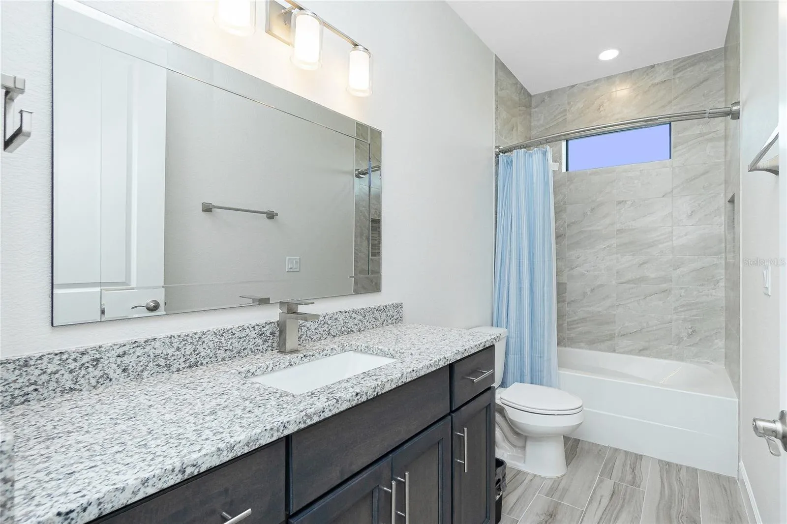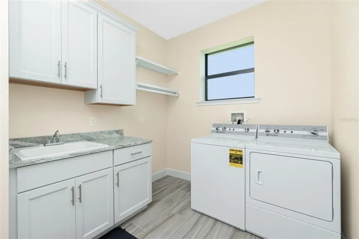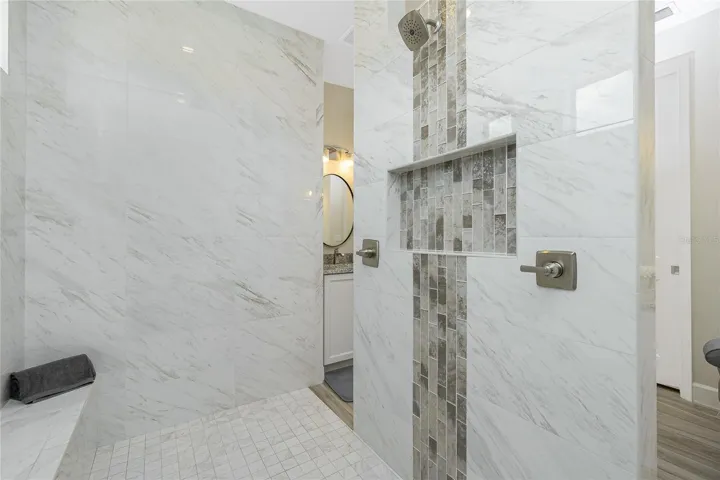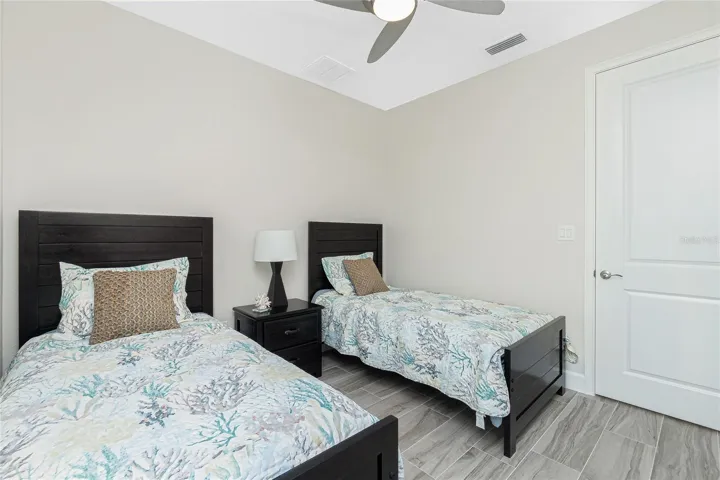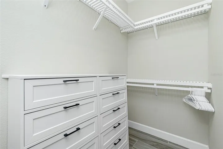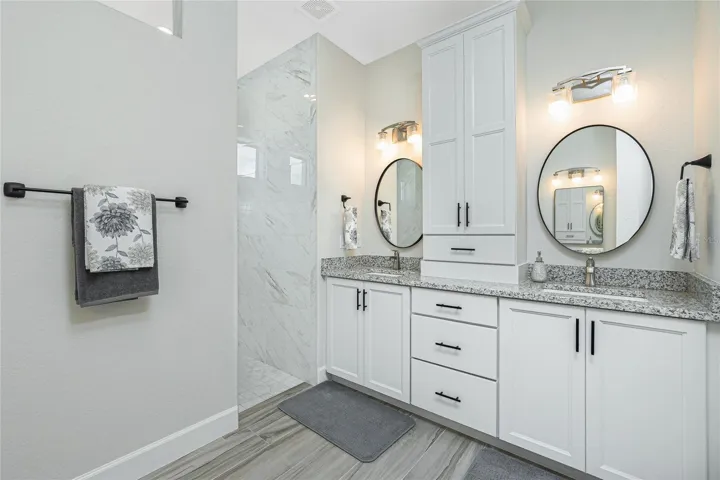 The owner’s suite is a private retreat, a spa-like en suite bathroom, a large walk-in shower with rain shower head, floor to ceiling tile and sitting bench. Dual sinks with plenty of storage along with a separate makeup vanity. Dual walk-in closets with custom built-in dressers and wood shelving. With a split plan, the additional bedrooms ensure comfort and privacy for family and guests alike.