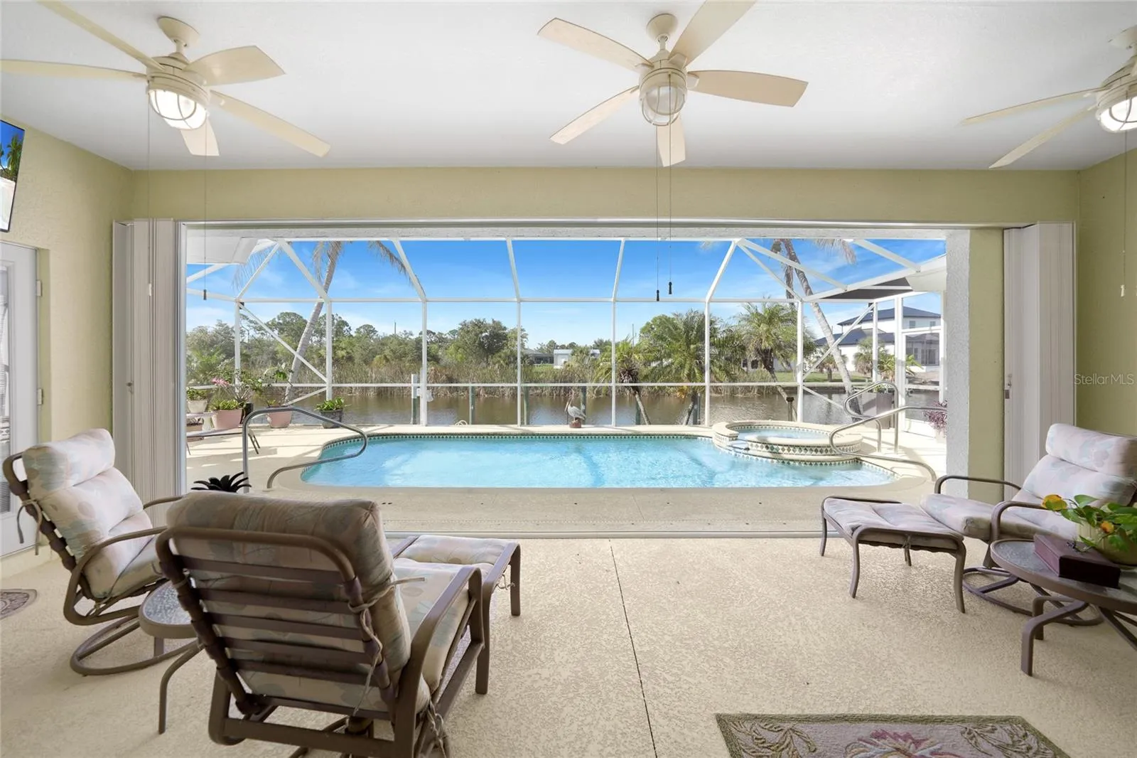 Outdoors, indulge in resort-style living with a sparkling pool, a waterfall-edge spa, outside access pool bath and a lush extra lot featuring a custom-designed gazebo accessed via an expansive pavered horseshoe driveway and a wide, elegant walkway. The spacious grounds offer plenty of room for your own personalized landscaping vision, allowing you to create a tropical paradise that reflects your style.