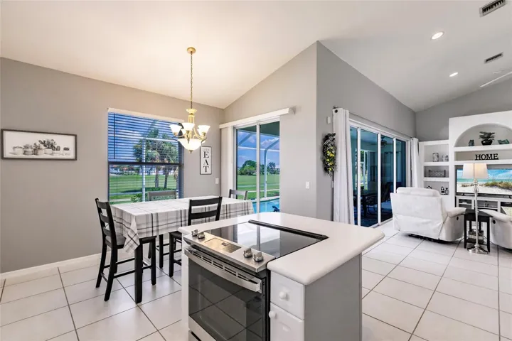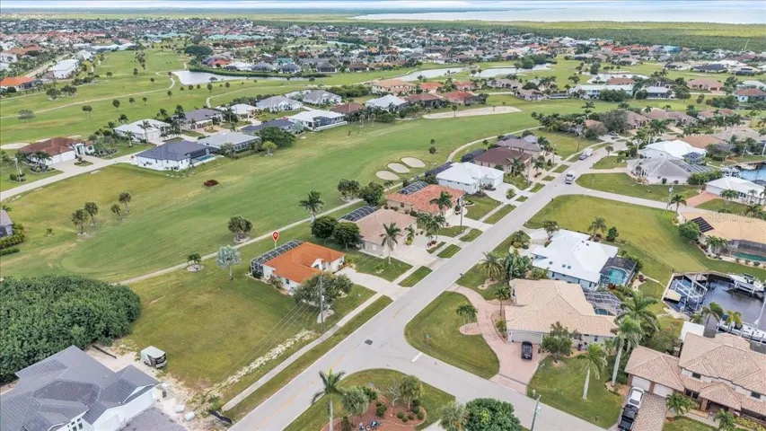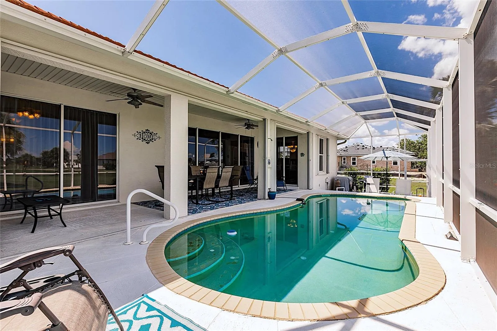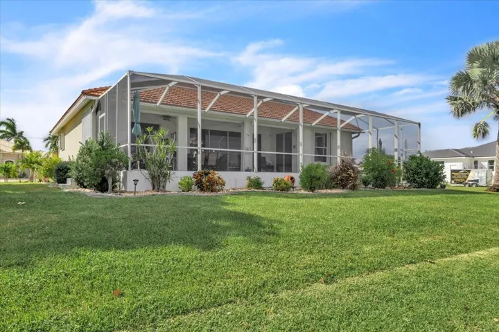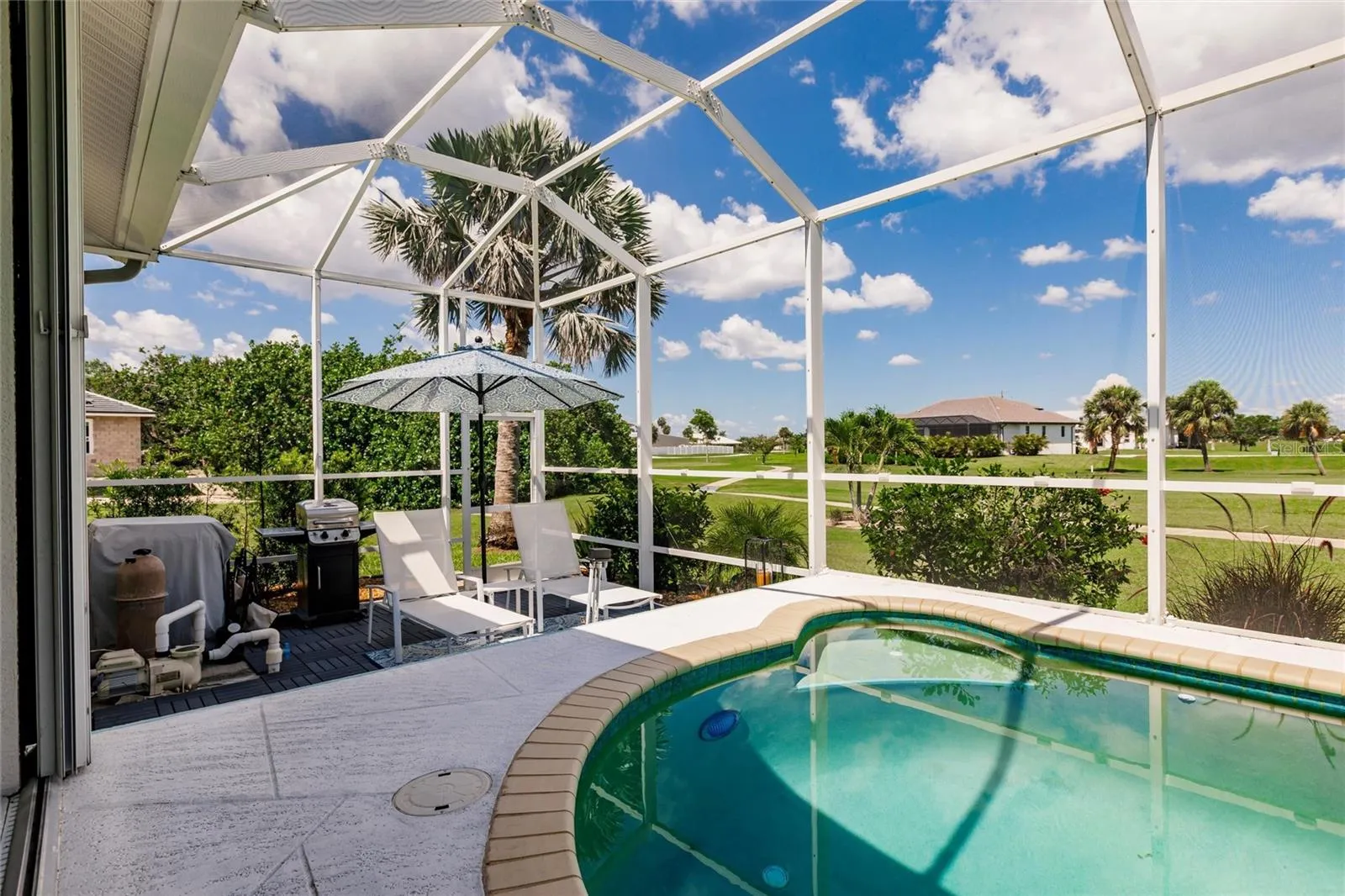 Stunning Pool Home on the 10th Fairway – Punta Gorda Isles! Experience Florida living at its finest in this meticulously maintained 2002-built pool home, perfectly positioned on the 10th fairway of the prestigious St. Andrews Golf Course in Punta Gorda Isles. With 1,624 square feet of living space, this home offers 3 bedrooms (or 2 bedrooms plus a den), 2 full bathrooms, and an attached 2-car garage. From the moment you arrive, you’ll be captivated by the home’s exceptional curb appeal, featuring a durable metal roof, nicely landscaped with outdoor lighting, full window storm protection, and a curved driveway leading to a welcoming screened-in front porch. Step inside to a bright and airy open-concept living area highlighted by soaring ceilings, tile flooring throughout, and tall 8-foot sliding doors that fill the space with natural light and offer seamless access to the lanai. A built-in entertainment center anchors the spacious living room, perfect for relaxed Florida living. The eat-in kitchen serves as the heart of the home, complete with new stainless-steel appliances, a center island with seating, sleek white cabinetry, a pantry closet, and direct access to the outdoor living area—ideal for entertaining. The expansive primary suite is a true retreat, featuring private pool access, dual closets (including one walk-in), and a luxurious en-suite bath with a soaking tub, walk-in shower, dual vanities, private water closet, and generous storage. Guests will appreciate two well-appointed secondary bedrooms—each with built-in closets—and a shared guest bath offering an extended vanity and walk-in tiled shower. The third bedroom, with French doors, also functions perfectly as a home office or den. Step outside to your easterly-facing lanai, designed for comfort and relaxation. Lounge in the shade or take a dip in the large, heated pool, complete with a new variable-speed pool pump and heater. Best of all, the screened lanai overlooks the scenic 10th fairway, offering tranquil golf course views that enhance the outdoor living experience. Additional features include an interior laundry room, Central Vac, outdoor pool shower, a new hot water heater (2024), A/C (2014), and a RainBird irrigation system with updated sprinkler heads. The roof and driveway were recently professionally power washed, enhancing the home’s overall curb appeal. Conveniently located near I-75 and US-41, this home is just minutes from Fishermen’s Village, historic downtown Punta Gorda, waterfront dining, boutique shopping, and some of Southwest Florida’s best boating and fishing.