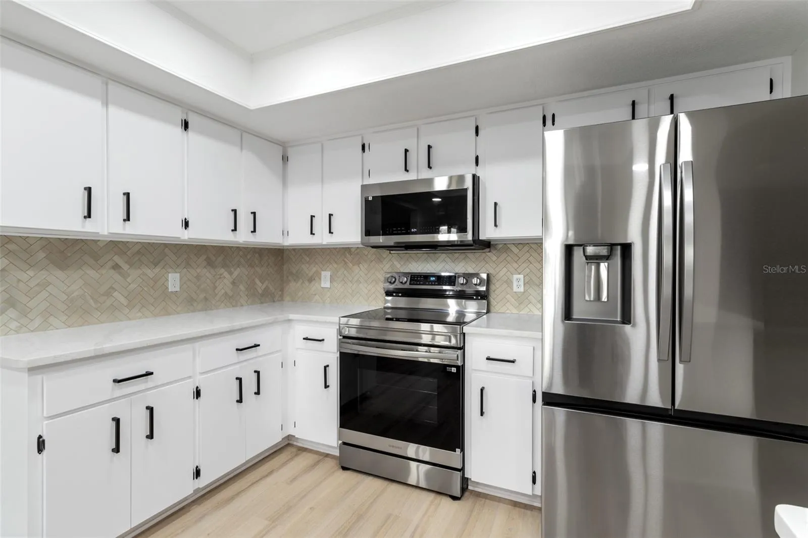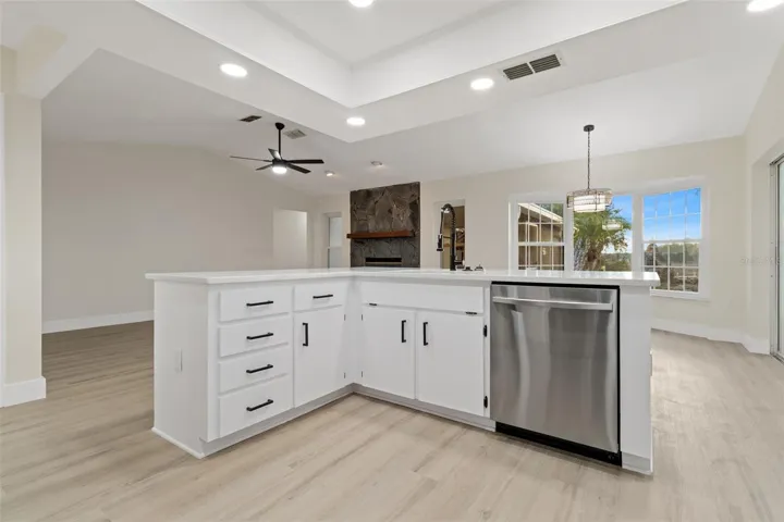 This home features a SPLIT FLOOR PLAN with an OPEN FAMILY ROOM AND DINING ROOM COMBO, a separate LIVING ROOM, and a DINETTE, offering plenty of space for entertaining or relaxing. Inside, you’ll find BRAND-NEW FLOORING, FRESH PAINT INSIDE AND OUT, and UPGRADED KITCHEN AND BATHROOMS designed with modern finishes. The ELECTRIC-CONVERT FIREPLACE adds a peaceful warm glow and character, creating a cozy atmosphere throughout. There are also sunlights throughout the home in addition to wide bay windows, which pour in natural lighting.