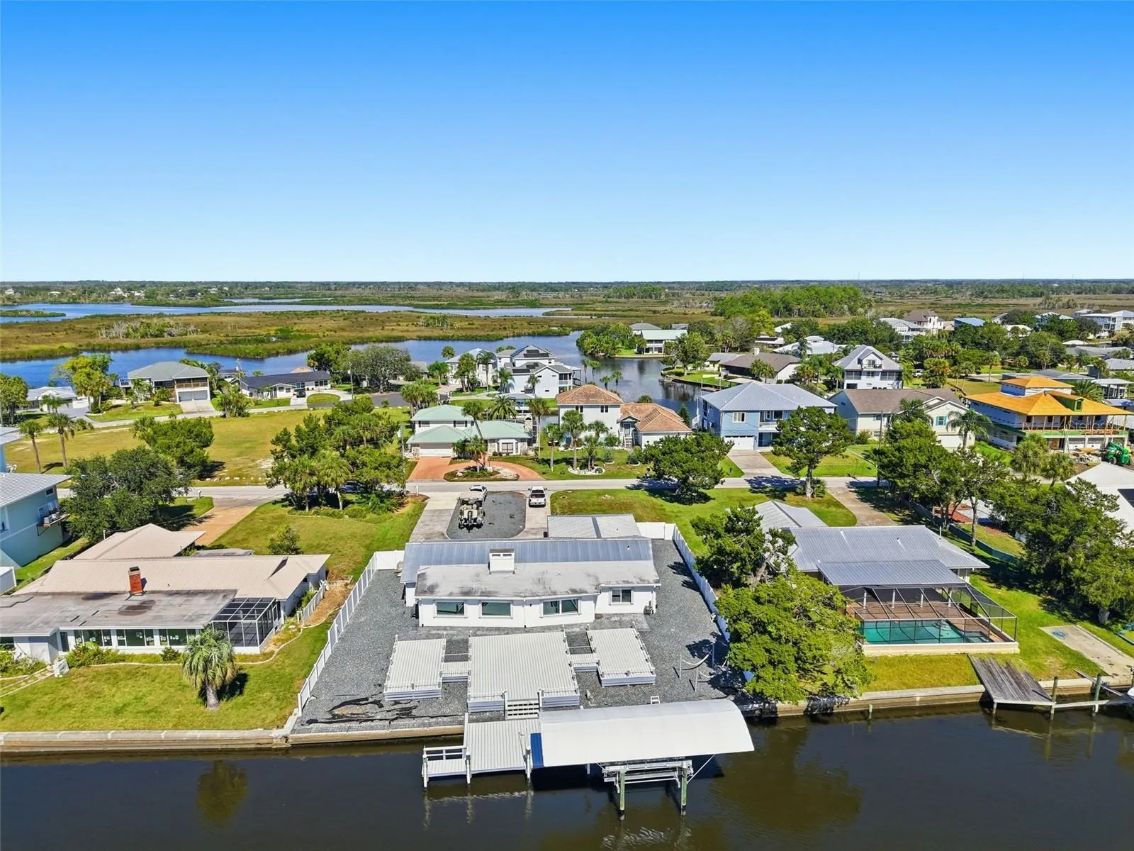 Outdoors, your private oasis awaits — a 50′ x 60′ PVC board deck crafted for elegance and endurance, complete with a 13,500-pound boat lift ready to accommodate your vessel. Every element of this home reflects quality, care, and the timeless allure of waterfront living at its finest.