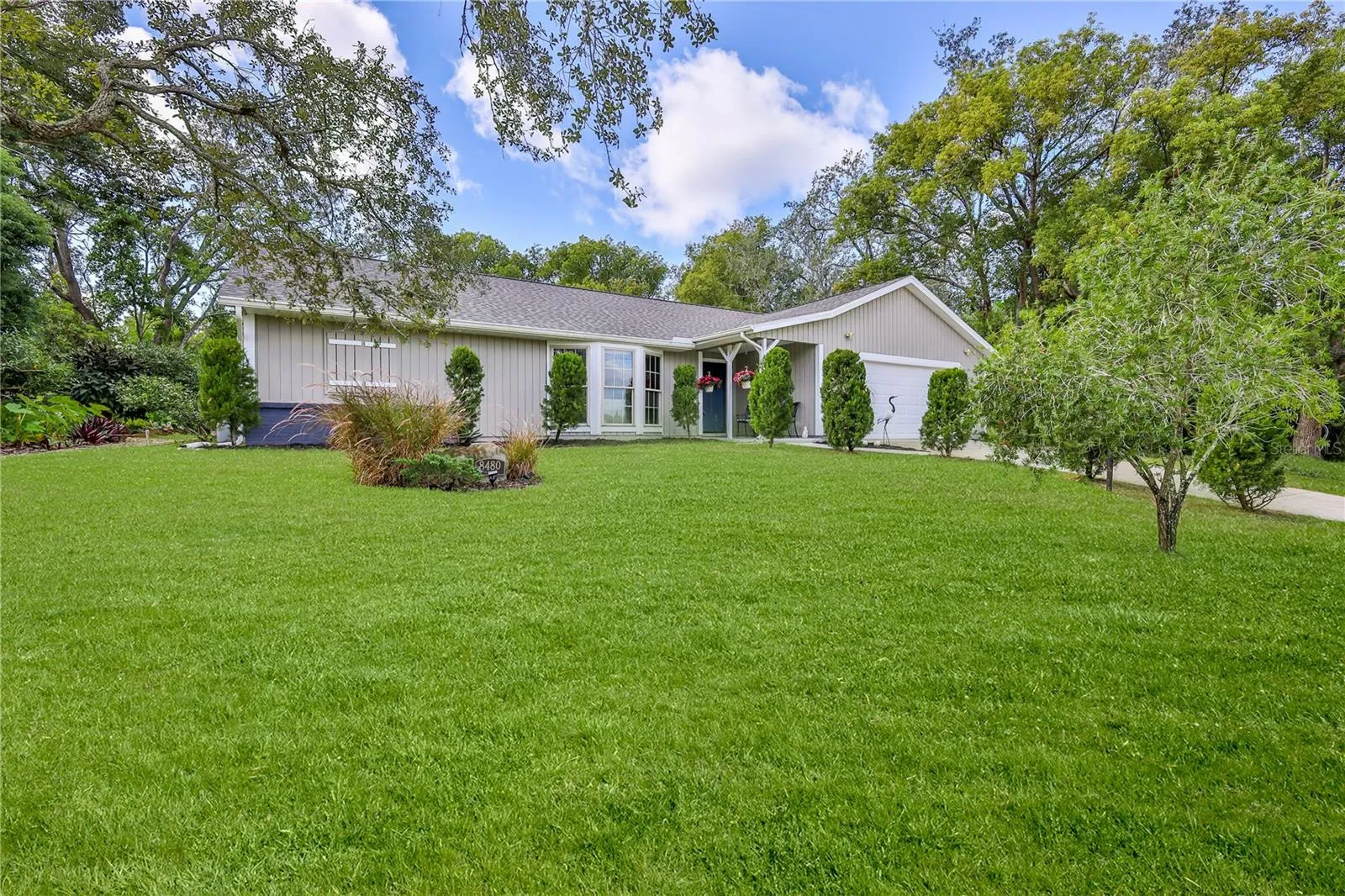 Welcome to your private garden paradise! This beautifully maintained 3-bedroom, 2-bathroom, 2-car garage, heated-pool home sits on a double lot surrounded by lush gardens, winding pathways, and mature trees—a true outdoor oasis. Step through the front door into a spacious split-living floor plan with imported Spanish tile flooring throughout and an abundance of natural light. To the left, the living and dining room combination features a beautiful chandelier and French doors leading to the covered lanai. The main suite is a peaceful retreat with French doors to the lanai, a large walk-in closet, and an en suite bathroom featuring a new vanity, updated shower, and linen closet. The kitchen is a showstopper—equipped with espresso custom cabinets, soft-close drawers, stainless-steel appliances 2023, a copper vent hood, Van Gogh granite countertops, a deep farmhouse sink, Lazy Susans, and a large pantry closet. There’s even a built-in kegerator! The kitchen opens to a bright family room with vaulted ceilings, recessed lighting, and a cozy gas fireplace. Pocket sliding and french doors open from the family room to the screen-enclosed lanai and sparkling pool area, complete with paver decking, ceiling fans, an outdoor shower, and even a slide for extra fun! The guest wing includes two comfortable bedrooms and a fully updated bathroom with a new stone-top vanity, tub/shower combo, and linen closet. One guest bedroom offers two closets and French doors to the lanai, making it ideal for guests or a home office. The outdoor living space is what truly sets this property apart—featuring a fire pit area, charming pathways and seating areas through tropical gardens, a gravel driveway, a storage shed with wooden deck, a concrete pad perfect for a bar setup, No HOA so bring your RV and boat! Additional features include a pool heater, gas fireplace hookup, irrigation on a well, newer double-hung windows, new Anderson front door and a house generator hookup with a switch in the garage. Roof 2022. HVAC 2021. HWH 2014. Remediated ground settlement with all documents, fully insurable and financeable. This home offers the perfect blend of comfort, character, and outdoor beauty—ideal for those who love to entertain, garden, or simply enjoy peaceful Florida living.