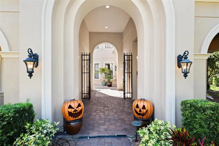 A stately tile roof and pavered drive framed by manicured landscaping lead to a charming front courtyard, setting the tone for the home’s timeless sophistication. Within the courtyard is a private in-law suite with a full bath and its own entrance, ideal for extended family or long-term guests. Enter the front door to soaring ceilings, architectural details, and walls of glass that create a bright, open flow perfect for entertaining or quiet retreat.