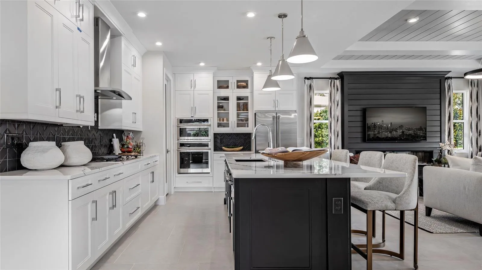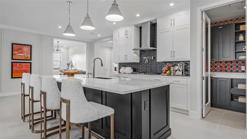 The chef-inspired kitchen is a centerpiece of this thoughtfully curated home, boasting frameless European-style cabinetry, a knee wall cabinet wrap, and a 24-inch-deep cabinet above the refrigerator with a side panel ensures extra storage and optimal functionality. 3cm quartz countertops and specialty-finish backsplash add sophistication and contemporary flair, enhancing everyday living and entertaining.