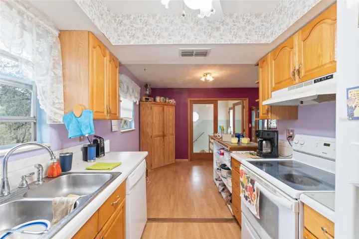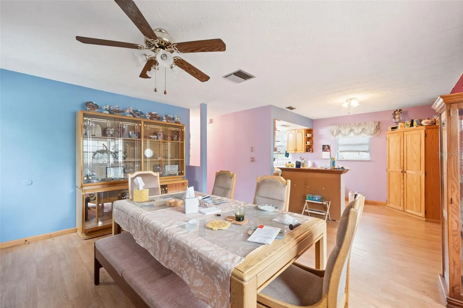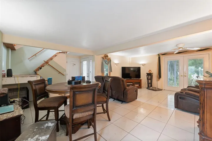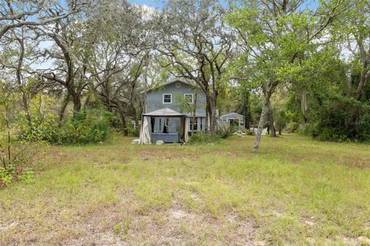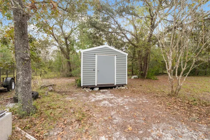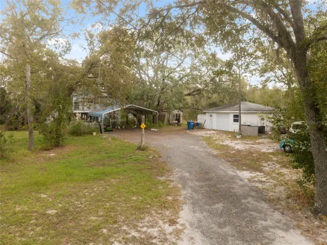 This unique two-story home offers comfort, flexibility, and inviting indoor-outdoor living with multiple thoughtfully designed spaces throughout, all situated on approximately one acre of land providing extra space and privacy. A screened front porch offers a welcoming place to unwind before entering the home. A covered front carport accommodates two vehicles, while a detached side garage provides additional parking and room for storage or workshop needs. The entry foyer welcomes you near the staircase, opening into the main living area on the first floor where neutral tile flooring flows seamlessly for easy maintenance. The living room provides direct backyard access, making it ideal for relaxing or stepping outside to enjoy the fresh air. Adjacent to the living room is a charming breakfast nook that opens to a dedicated she shed currently used as a gaming or hobby room, with a matching shed on the opposite side of the home for practical storage. The primary bedroom is also conveniently located on the ground level and offers a peaceful retreat with a walk-in closet, an en suite bathroom with a walk-in shower and built-in cabinets, and a floor-to-ceiling window seating area overlooking the greenery in the backyard. The ground floor also includes a laundry room with a sink and upper cabinetry for organization. Upstairs, luxury vinyl flooring extends through the spacious dining room that opens to a wide second-story balcony, where there is ample room for outdoor lounging and grilling. Around the corner, the kitchen features warm wood cabinetry, generous counter space, and a dual sink, with easy flow to the family room that boasts large sliding windows offering relaxing backyard views—an ideal setting for gatherings or quiet evenings. Bedrooms two and three are also located upstairs and feature cozy carpeted flooring and large windows that allow natural light to fill the rooms; one includes its own walk-in closet while the other offers standard closet storage. Outside, the backyard includes a covered spa area that creates a private retreat surrounded by mature landscaping and quiet natural surroundings. This home is located close to Weeki Wachee Springs State Park, known for kayaking and crystal-clear natural waters; Pine Island Beach Park, a local favorite for laid-back Gulf Coast sunsets; and the Nature Coast Botanical Gardens, offering peaceful walking paths and seasonal blooms.
