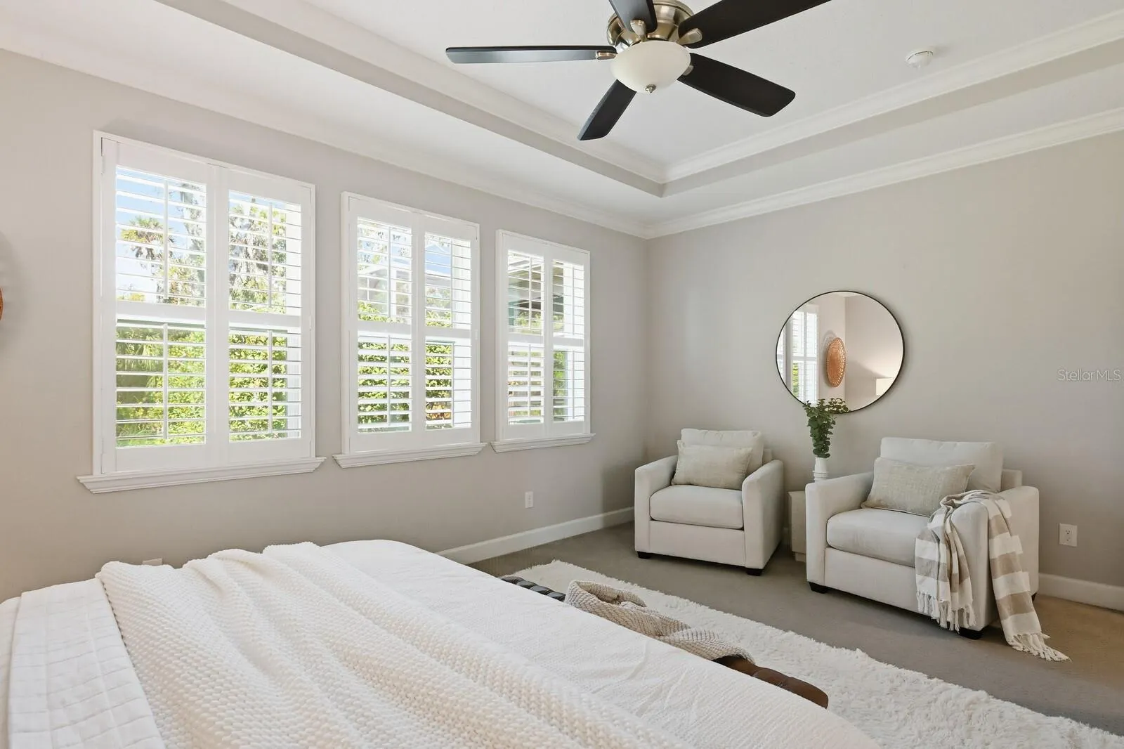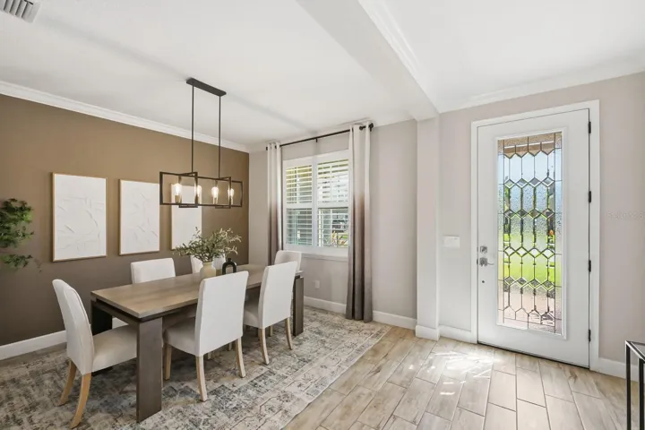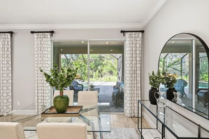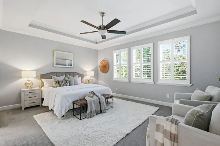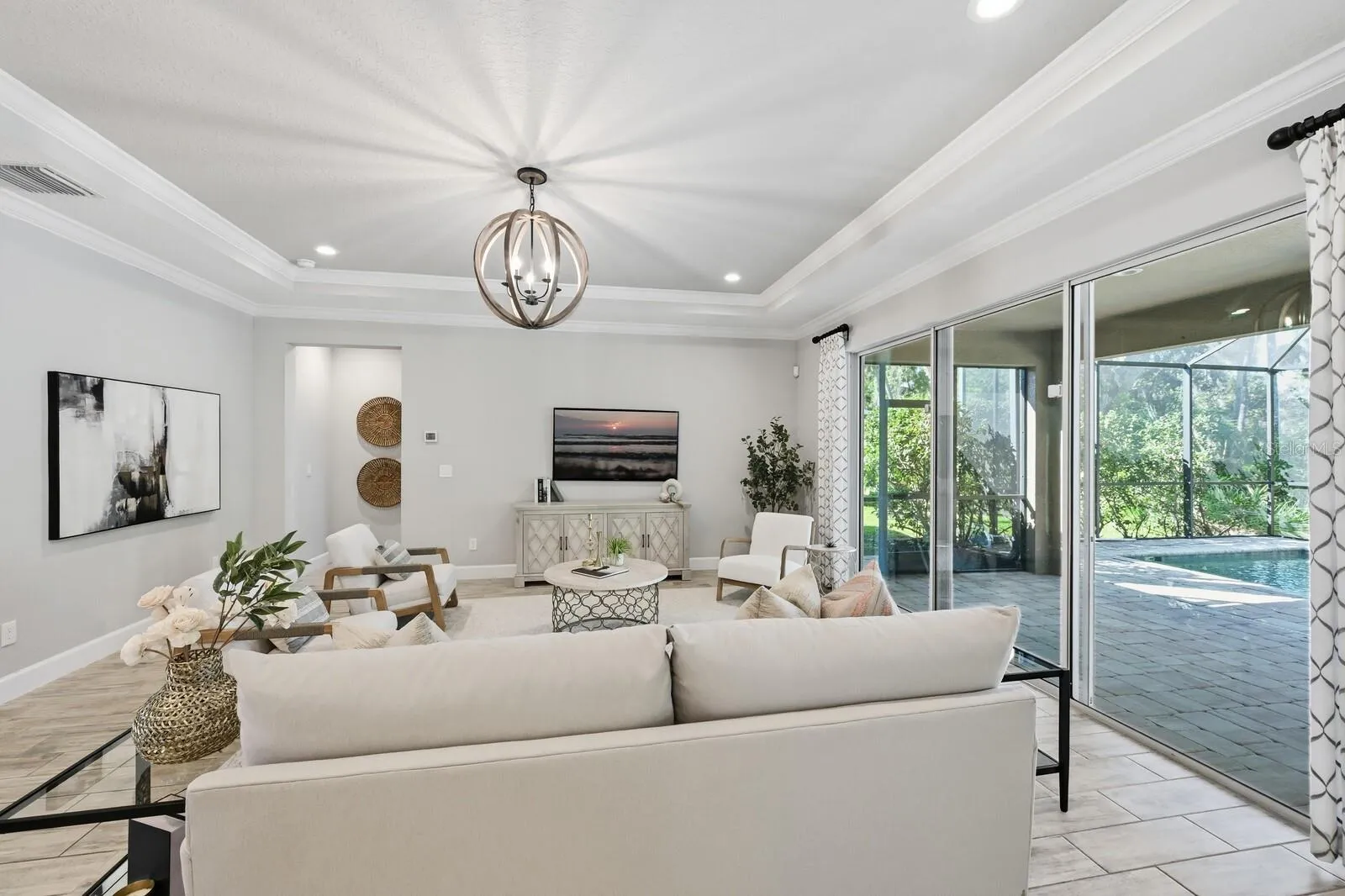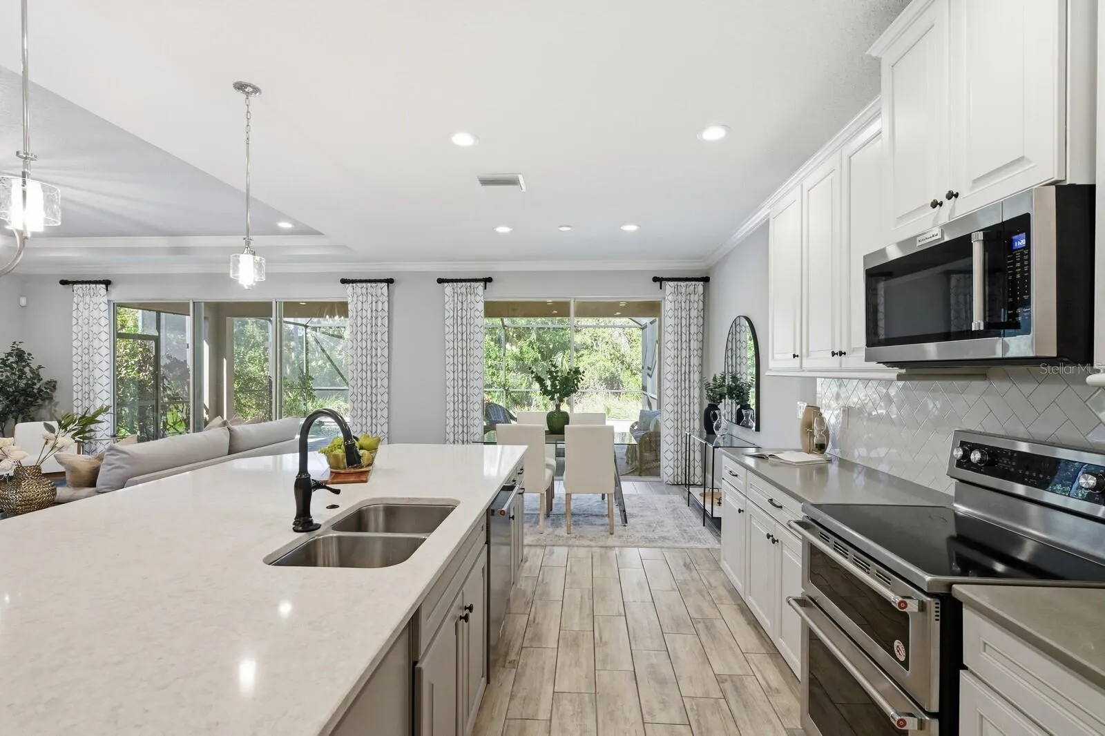 Modern white cabinetry in the kitchen also featuring a large center island, stainless steel appliances, quartz countertops and walk in pantry. Additional breakfast nook looking out to the living room also with tray ceiling and expansive sliders that open to a large pavered lanai and heated saltwater pool—perfect for relaxing or entertaining.