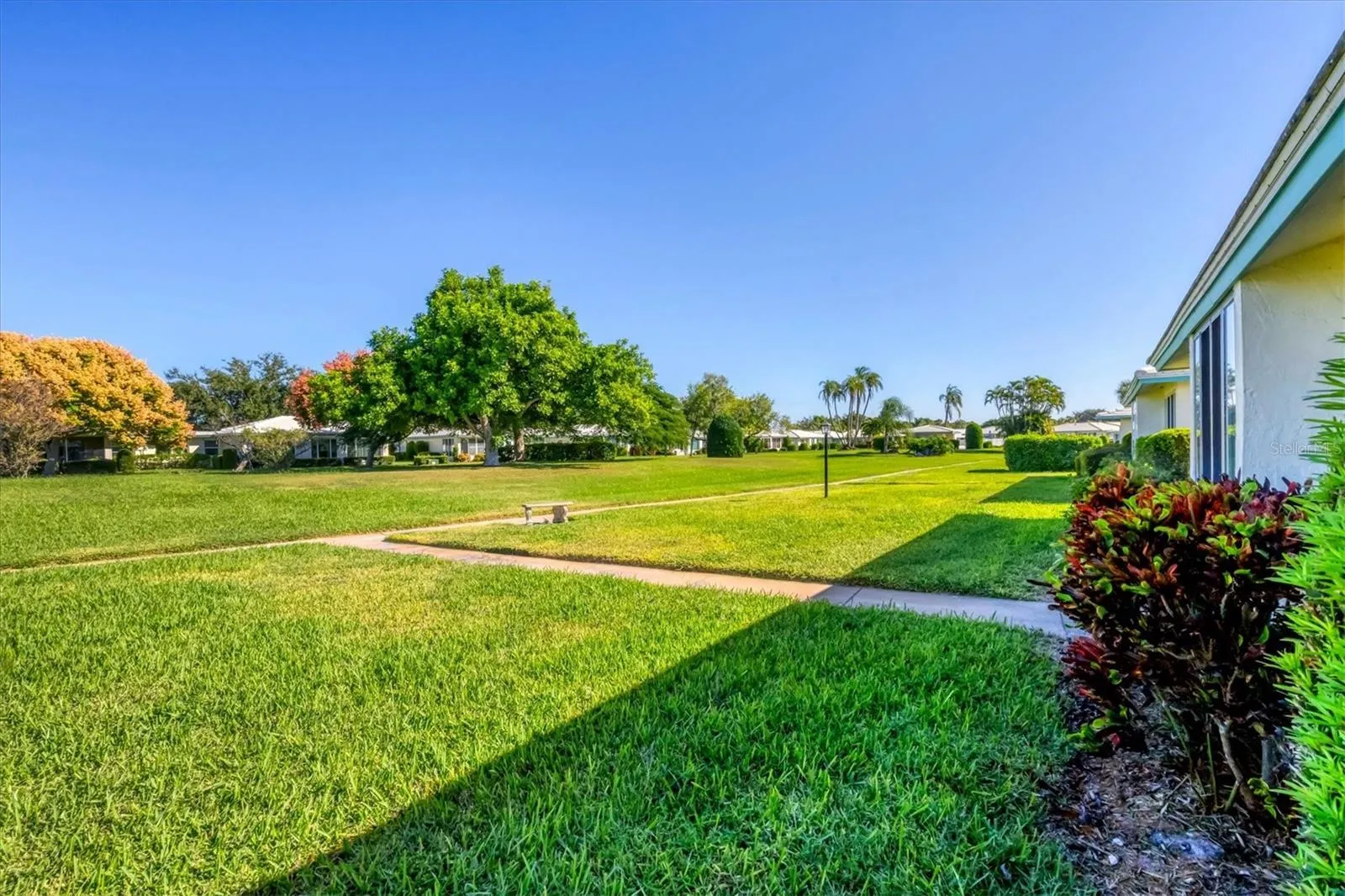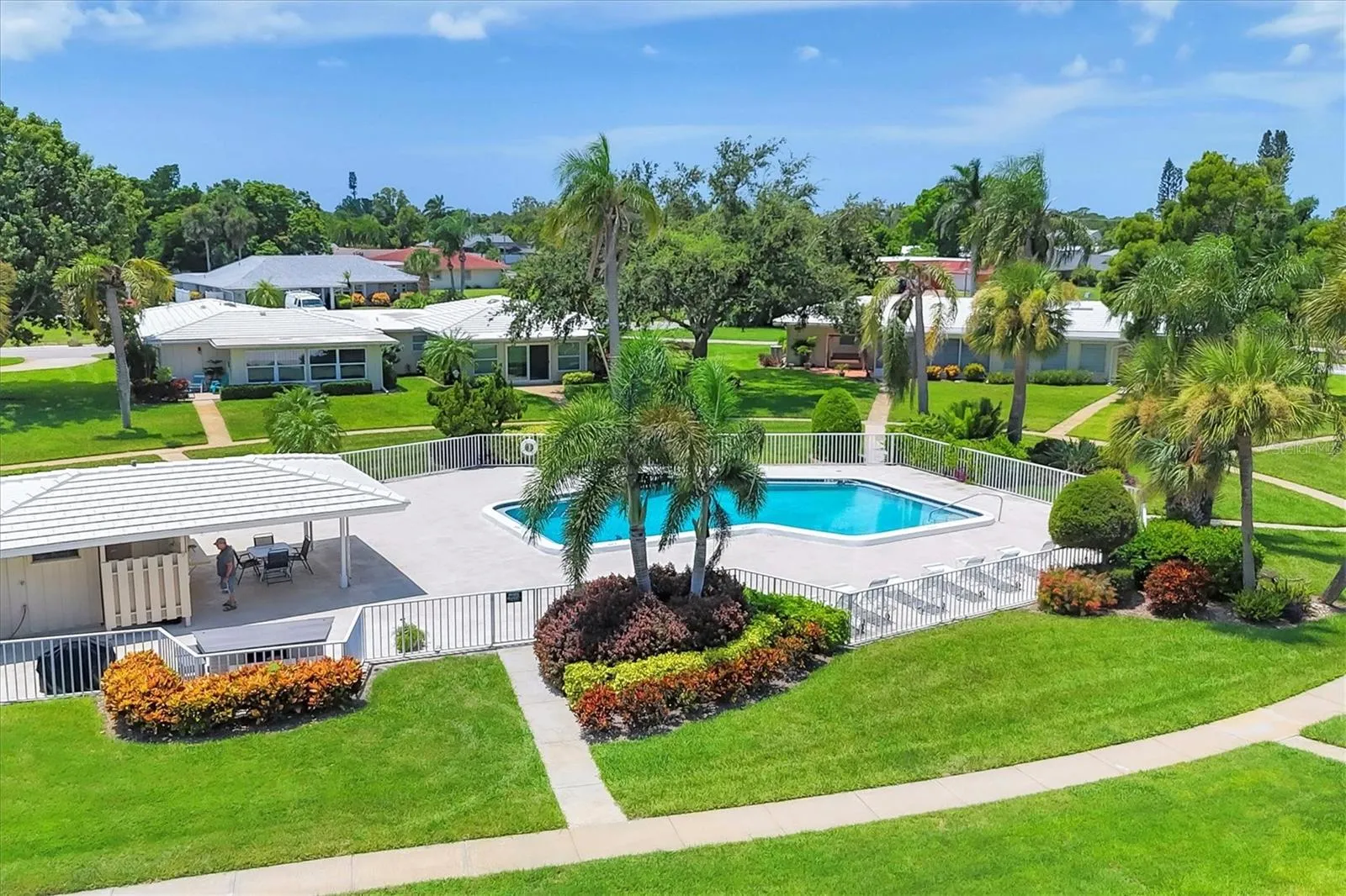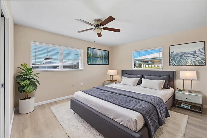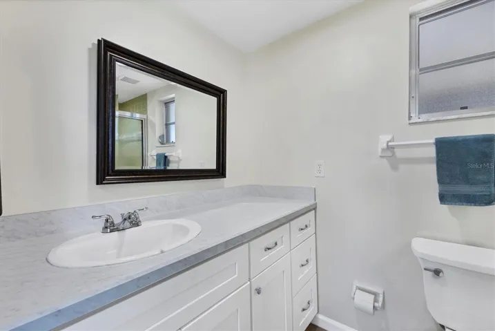 One or more photo(s) has been virtually staged. Located in a prime west Bradenton area, this two-bedroom, two-bath paired villa condominium with a one-car garage is situated within the 55+ Village Green community on a peaceful cul-de-sac, just 5.7 miles from Holmes Beach on Anna Maria Island. This well-priced property offers an excellent opportunity for use as either a permanent residence or a seasonal retreat. The unit is located outside designated high-risk flood zones, thereby minimizing insurance liabilities and improving overall security. The unit has a glassed in Florida room with pleasant greenbelt view. The kitchen now features shaker wood cabinets, dovetail soft-close drawers, a recently purchased refrigerator and garbage disposal. The installation of shaker wood vanities and modern fixtures in both spotless bathrooms has been completed. Other recent updates include laminate flooring, electric garage door opener, hot water heater in 2022, the A/C duct work was replaced in 2014, the air handler and compressor in 2015. Residents may keep one pet weighing up to 15 pounds, pending approval from the board. The condo fee is $433 monthly, but is paid quarterly at a rate of $1,300. This fee covers basic cable, internet, access to the heated community pool, escrow reserves, lawn care, irrigation, pest control, pool maintenance, roof cleaning, and exterior painting. Your insurance policy will be an HO6 policy. Village Green is a wonderful community, offering convenient access to GT Bray Park, Robinson Preserve, Downtown Riverwalk, and SRQ Airport—so don’t miss this opportunity. Contact the listing agent to schedule your private showing and enjoy Florida living.