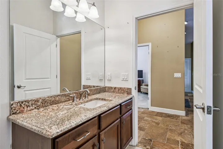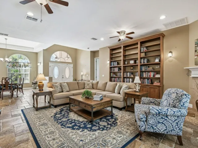 One or more photo(s) has been virtually staged. Resort-style living awaits in this elegant two-story home featuring 10-foot ceilings and a first-floor primary suite with dual walk-in closets, double vanity, garden tub, step-in shower, and direct access to the screened-in saltwater pool & spa. The home includes a private home theater with seating for 6–8 and built-in bookshelves in the living room, perfect for family gatherings or movie nights.