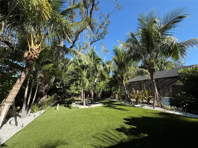 As the sun sets, the property transforms into a tropical dream. Luxury landscape lighting accentuates the palms and pebble pathways, while the automated mosquito misting system ensures every evening is as comfortable as it is beautiful. A new irrigation well supports the lush grounds, designed with Mexican beach pebbles, vibrant greenery, and a mix of native and exotic palms that rival Sarasota’s finest estates.