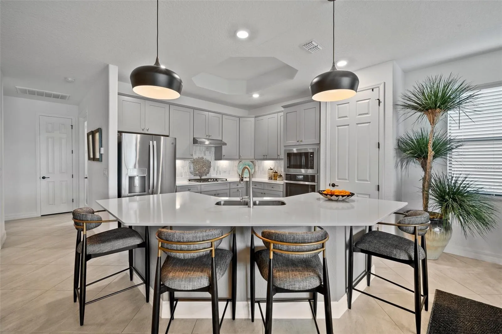 Voted Best Golf and Gate Community on the West Coast! Golf included in HOA featuring two Champion Golf Courses (Featured on The Korn Ferry Tour). Nestled within the prestigious Lakewood National Golf Club community in Lakewood Ranch, this exquisite home offers an unparalleled lifestyle for golf enthusiasts and luxury seekers alike. The open-concept Isabella floor plan features 4 bedrooms and 2 full baths in a split layout for added privacy. Step inside to discover a spacious kitchen featuring elegant quartz countertops, solid wood cabinetry, a stone backsplash, a gas cooktop, a built-in oven, under-cabinet lighting, and an expansive breakfast bar overlooking the living room. The formal dining area is ideal for entertaining, while the living room boasts tray ceilings and large sliding glass doors, opening to the inviting extended lanai. The primary suite is a true sanctuary, complete with dual walk-in California closets, an ensuite bathroom with double sinks, a glass-enclosed walk-in shower, and a luxurious garden tub. Sliding glass doors provide direct access to the lanai, offering a seamless blend of indoor and outdoor living. Three additional bedrooms and a full guest bathroom provide ample space and functionality. The expansive lanai, equipped with hurricane blinds, overlooks the pristine golf course and is perfect for outdoor entertaining, complete with a full outdoor kitchen featuring a built-in grill and hood, a beverage fridge, seating areas, and dining space. Extra touches throughout the home include a 2-car garage with epoxy flooring, California closets in the garage and laundry room, Ring security system, and gutter installations. Ownership includes a full membership to Lakewood National’s 36-hole championship golf course and access to outstanding amenities. Enjoy the heated main pool with waterfalls and lap lanes, a poolside Tiki Bar & Café, a new clubhouse with two on-site restaurants, tennis and pickleball courts, a state-of-the-art fitness center, and more. Lakewood National offers a Lifestyle Director who organizes trivia and karaoke nights, holiday parties, and music/movie nights. Don’t miss the chance to experience this extraordinary home and lifestyle firsthand. Schedule your private showing today and step into the Lakewood National dream!