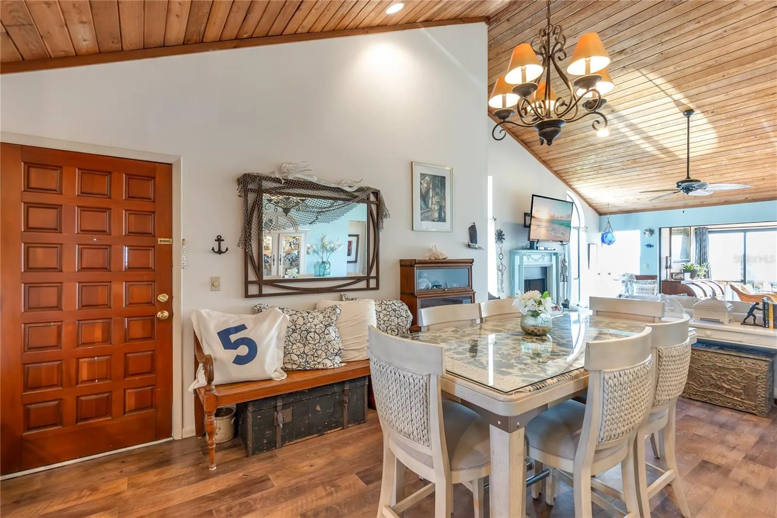 MOTIVATED SELLER! Nestled in the waterfront community of Bay Hollow, this spacious 2-bedroom, 2-bath end-unit condo offers over 1,700 sq. ft. of thoughtfully designed living space. Soaring cedar-plank ceilings, a wood-burning fireplace, and large windows fill the home with natural light and warmth. The updated kitchen features wood cabinetry, a farmhouse sink, stainless steel appliances, and a cozy spot for morning coffee or casual dining. A versatile bonus room with sliding doors and screens provides the perfect flex space for an office, art studio, or yoga retreat, while the enclosed lanai offers peaceful views of the mangrove-lined waterway. The primary suite has vaulted ceiling, walk-in closet, and ensuite bath, and the guest bedroom opens to the flex space. Step outside to your private deeded boat slip with water and electric, providing quick access to popular sandbars and waterfront restaurants or just under 10 minute drive to Anna Maria Island beaches. Additional updates include a 2.5-year-old roof, 2019 AC, new screens, washer/dryer (2021), water heater (2024), refrigerator (2015), oven (2015), microwave (2024), and dishwasher (2015). Perfect as a full-time residence or seasonal retreat, this condo offers effortless coastal living with maintenance-free convenience.