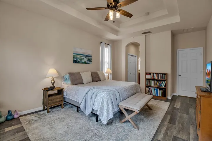 The primary suite is perfectly positioned on its own wing for peace and privacy, featuring tray ceilings, private sliding glass doors with direct access to the backyard, and plenty of natural light. The primary bathroom feels like a retreat, with dual vanities, a soaking tub, and a walk-in shower, offering the kind of comfort and design rarely found in newer construction homes today.