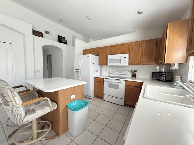 Step inside to find a large formal living and dining area, perfect for hosting or relaxing. The kitchen features an island, dishwasher, and abundant counter space, opening to a secondary dining area and cozy TV room. From here, you can step out onto the large screened lanai—ideal for enjoying Florida’s year-round sunshine.