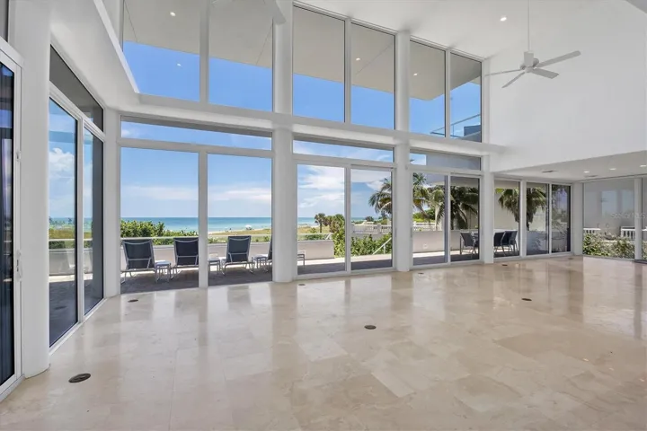 Inside, you’ll find an open living and dining area with vaulted ceilings and multi-level walls of windows that bring in natural light and frame the Gulf.