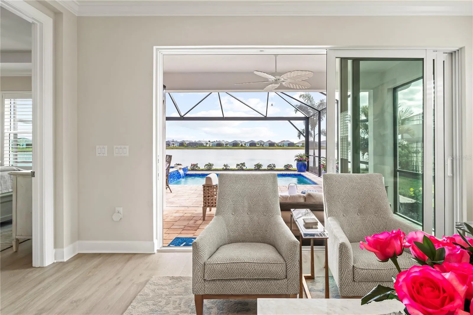 Luxury Golf-Deeded Home in Esplanade at Azario Lakewood Ranch! Step into paradise in this stunning professionally decorated Arezzo model in this exclusive, resort-style community. Perfectly situated with views of the largest pond in the community, this elegant home combines modern luxury with a relaxed, tropical vibe. Inside, you’ll find an open-concept floor plan with wood-look tile flooring throughout, tray ceilings, gorgeous designer light fixtures and Norman Shutters. The chef’s kitchen features premium stainless steel appliances, quartz countertops, and elegant finishes flowing effortlessly into the dining and living areas, ideal for entertaining. The living area opens to a covered lanai with Flat Screen TV, Gas Grill and tranquil water views, the perfect spot to unwind with a sunset dinner poolside. The primary suite offers a private retreat with a King Bed, Flat Screen TV, spa-inspired ensuite bath, walk in shower, double vanities, and a large walk-in closet. The home also offers two additional bedrooms with Queen Beds, a full bath with double sinks, a private den and spacious laundry room. Esplanade at Azario offers world-class amenities: 18 Hole Championship golf course, a resort-style pool with Tiki Bar, full-service day spa, fitness and yoga classes, pickleball and tennis courts, a culinary center with fine dining, a casual pizzeria, wine tastings, and community events. Owners membership transfers to you for one time $100 membership fee. Owner keeps one car in two car garage. NO PETS ALLOWED. All utilities included with a $200 cap on gas (pool and spa heated with gas). $10,000 Month