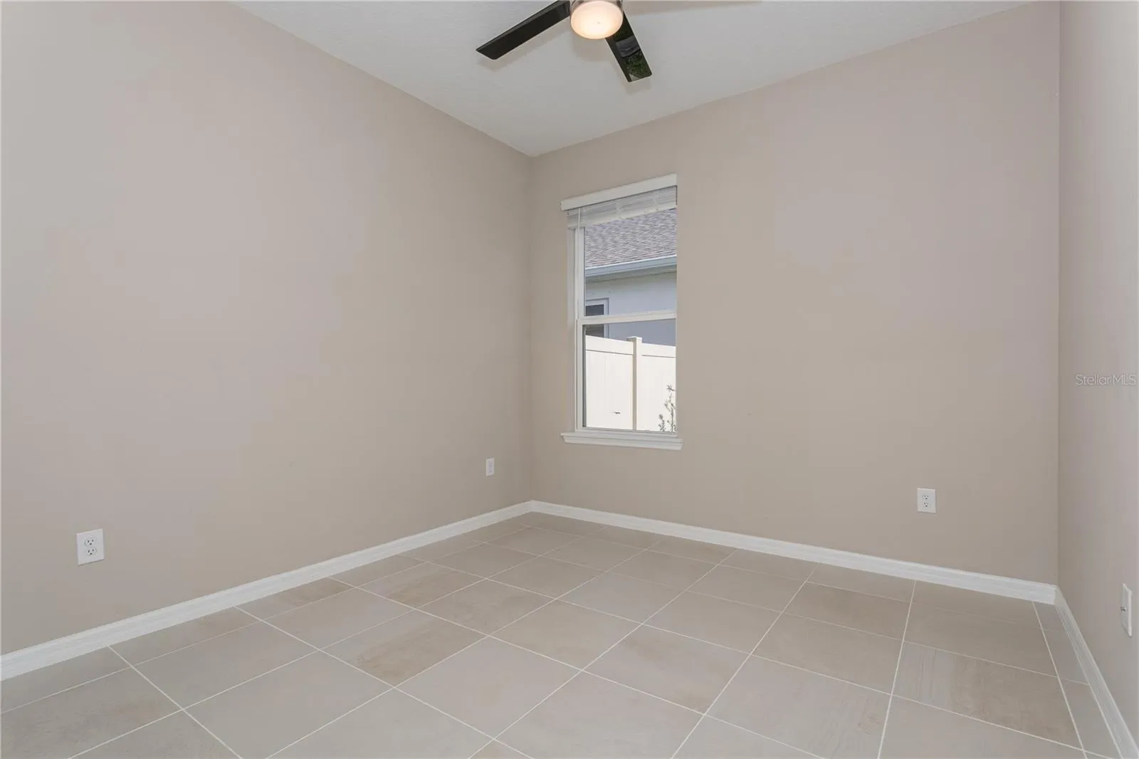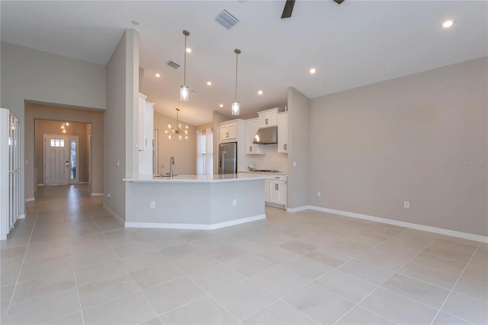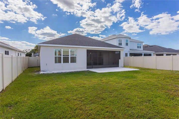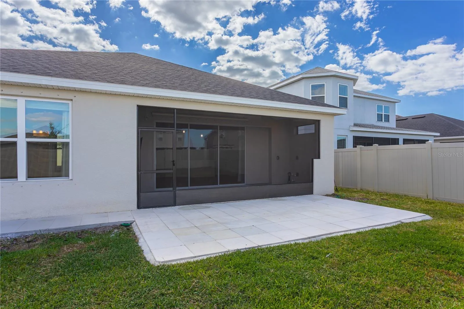 Step inside to find sleek tile flooring throughout and a modern kitchen featuring stainless steel appliances. The open-concept living area flows seamlessly to a screened-in lanai, ideal for relaxing or entertaining, with direct access to a fully fenced backyard.