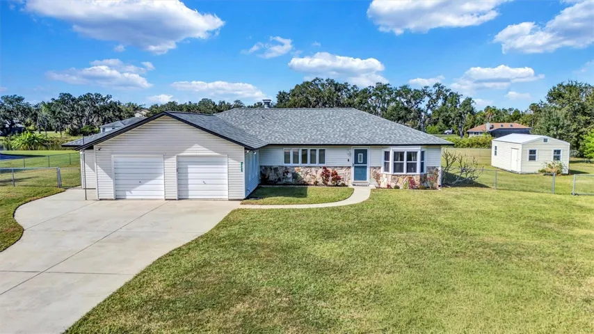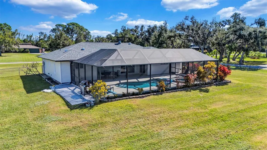 Rare find! Have you been craving an escape from the hustle and bustle of city life and desire to live in the country, but the commute seems a bit too far? Then you just found your dream home, free from HOA living, tucked away in a quiet neighborhood nestled on 1.27 acres of sprawling green lawn in a serene setting overlooking a beautiful pond. Imagine bike rides in the country, while still being 5 min from grocery stores, shopping, restaurants, and I-75 for easy commute. This one story home offers 4 bedrooms, 2 baths, a 2 car garage, plus outside storage shed, and a small bonus room off the garage that could serve as your perfect private office, hobby room, or just extra storage! In the evenings watch as the sky fills with purple, orange, and pink hues on your oversized, screened lanai while taking a dip in your heated pool or spa or throw a football in your fenced in field. Updates include new roof (2022),new septic tank (2023), well pump and well head (2024), wood look tile throughout, epoxy coated garage floor, new bathroom vanity in guest bath, and freshly painted pool deck. Bring your boats, trailers, and pets because there is no HOA and a large fence with wide opening for trailer access. Perfect place for your own garden. Get your slice of paradise while you have the chance. Short drive to both Anna Maria Island or St. Pete beaches. Schedule your showing today!