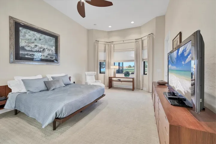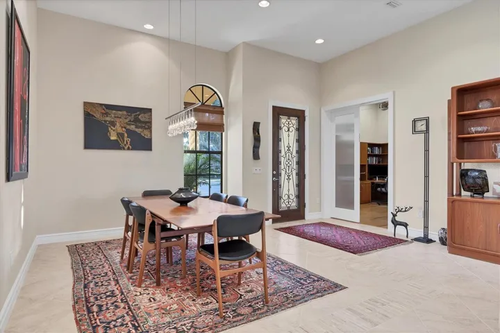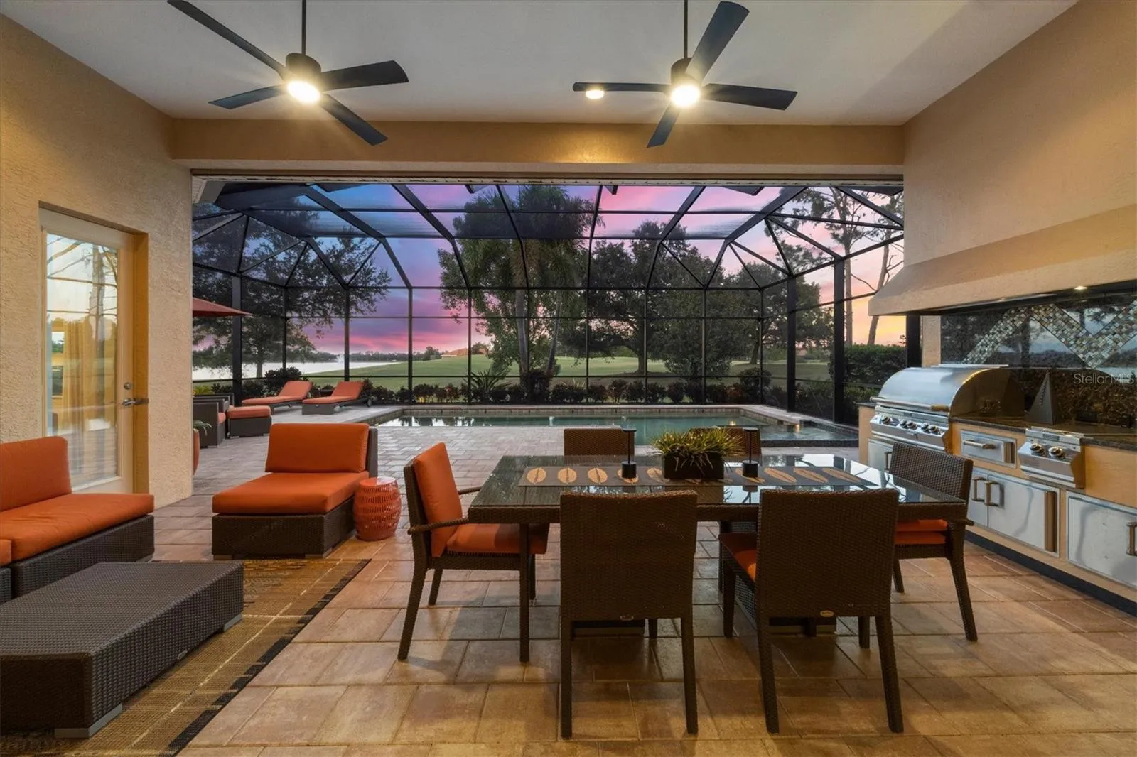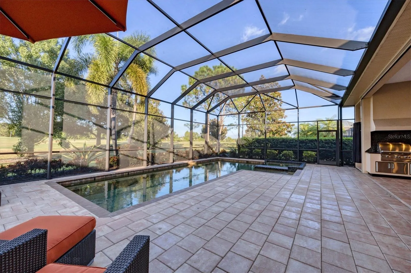 This striking three-bedroom, two-and-a-half-bath, open layout residence offering nearly 3,000 square feet of refined living space, oversized 3.5-car split garage, has one of the most spectacular views, on a cul-de-sac in the prestigious gated community of Country Club East. This incredible home blends architectural grandeur with modern sophistication. An impressive arched portico framed by twisted columns and manicured landscaping create a grand first impression. Through the custom glass door, soaring ceilings, designer lighting, porcelain tile flooring, and abundant natural light through impact-resistant windows and doors set a tone of relaxed elegance. The open floor plan flows effortlessly through the formal living and dining areas into a designer kitchen showcasing custom wood cabinetry, an oversized granite island with stunning onyx quartz countertops and GE Profile stainless appliances, including a gas cooktop with vented hood, built-in oven, warming drawer, convection microwave and refrigerator. Just off the kitchen, you’ll find a built-in office nook, dry bar with beverage refrigerator and access to a convenient pool bath. Expansive sliding glass doors open to an oversized screened lanai with hurricane-proof Storm Screen for added protection, and newly painted and re-screened cage, designed for year-round enjoyment. It comes complete with an impressive outdoor kitchen, saltwater, oversized pool and spa, outdoor shower, and breathtaking views of the 14th hole on the golf course and tranquil lake. The primary suite offers a serene private retreat, featuring plush carpeting, custom walk-in closets and a spa-inspired bath with split vanities, freestanding soaking tub, glass-enclosed shower and private water closet. Past the hallway of four double closets for extra storage, you’ll find two guest suites with custom closets that share a stylish Jack and Jill bath, while a dedicated office with wood flooring provides the ideal workspace. The laundry room with custom cabinetry ensures convenience and functionality throughout. The home also features a whole-house generator and full security system providing seamless comfort and peace of mind, a circulating hot water heater, in-house vacuum system, an oversized 3.5-car oversized garage that includes your temperature-controlled workout area and extra storage and utility sink, brick paver driveway and meticulous landscaping. In Country Club East, one of Lakewood Ranch’s sought-after villages, residents enjoy 24-hour gated security, resort-style pools, fitness centers, parks and scenic walking trails. Optional membership to The Lakewood Ranch Golf and Country Club provides access to four championship golf courses, tennis and pickleball facilities, fine dining venues and an engaging social calendar, all just minutes from Waterside Place, Lakewood Rach Main Street, boutique shopping and Gulf Coast beaches.