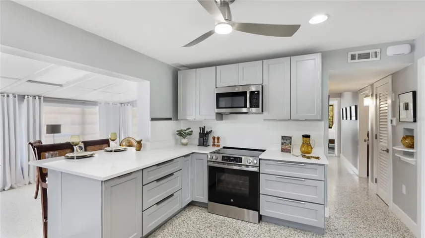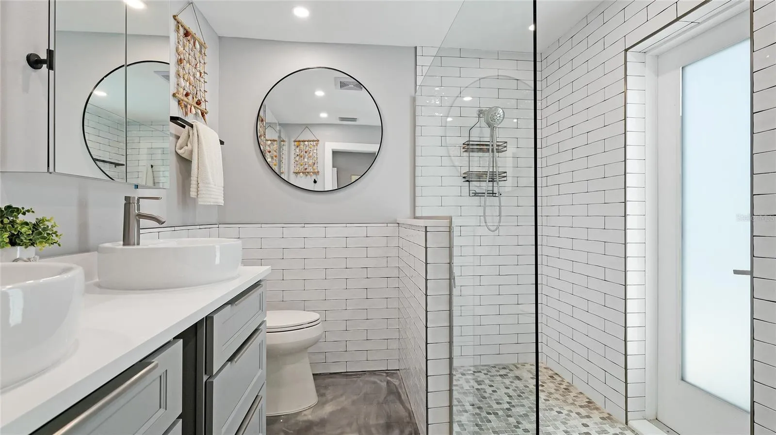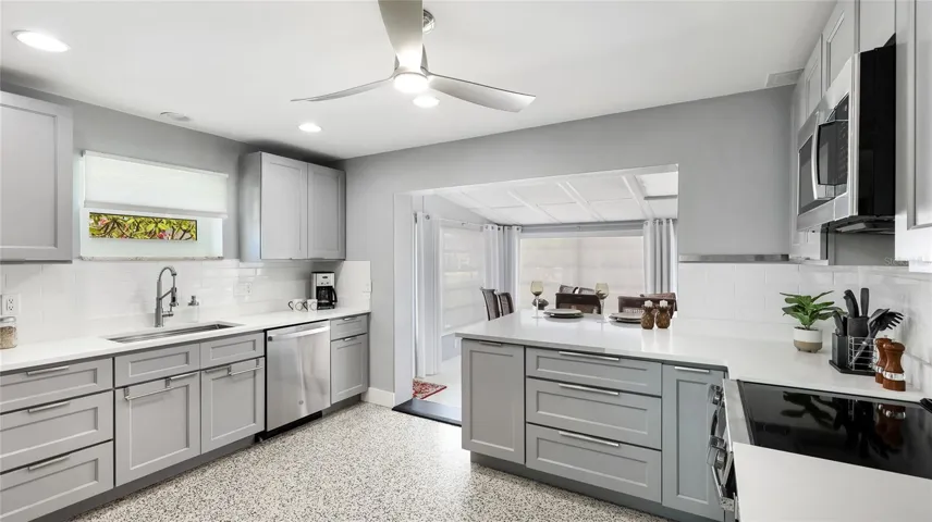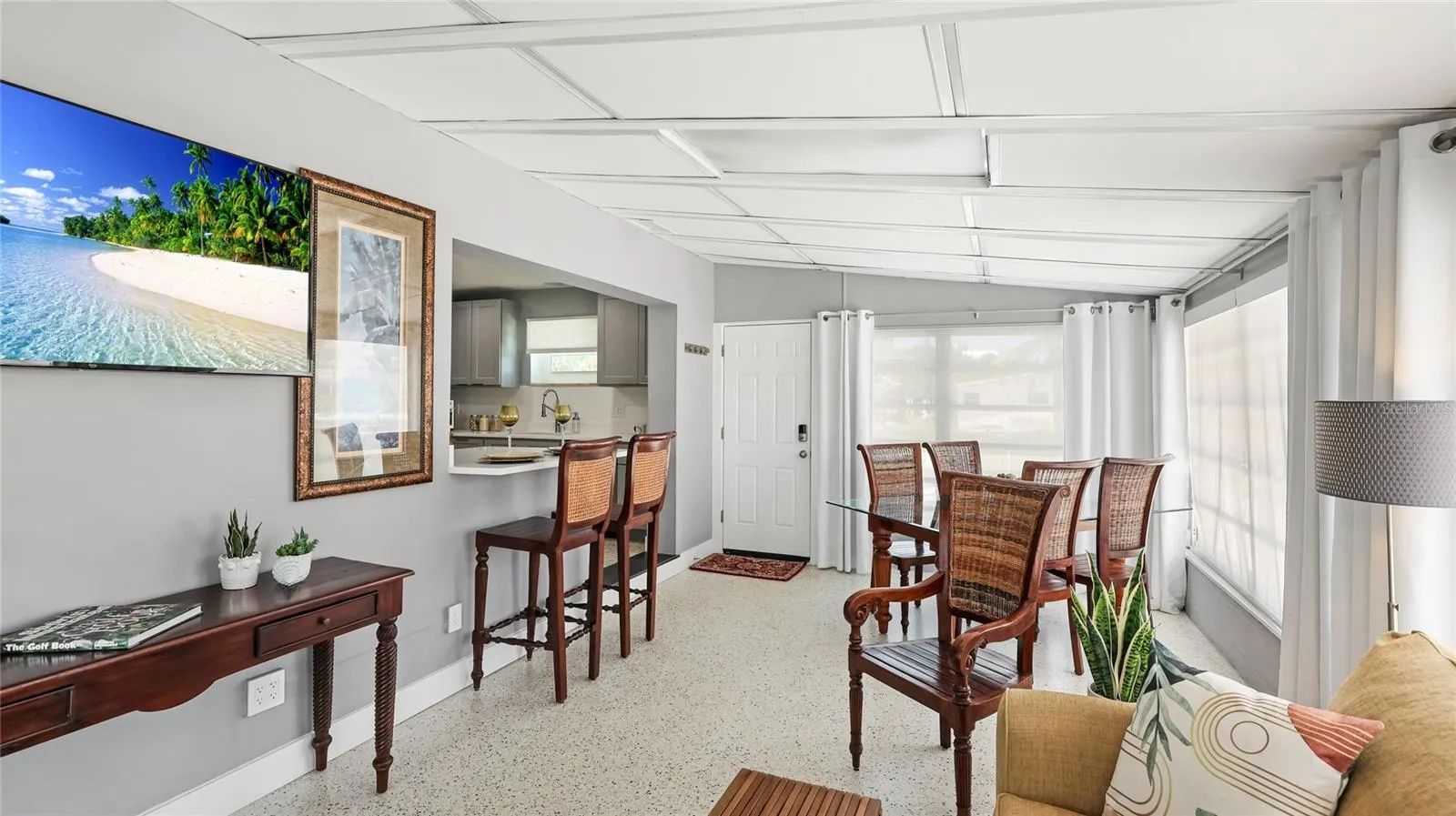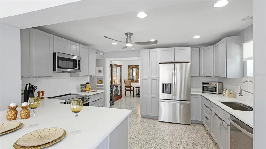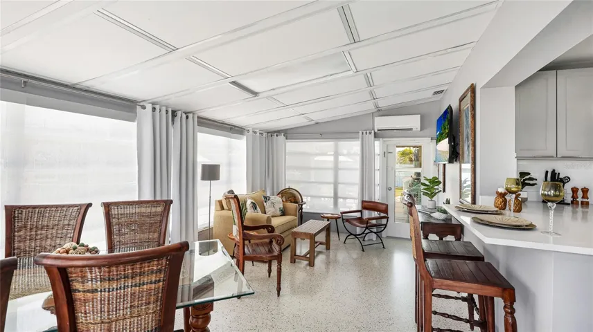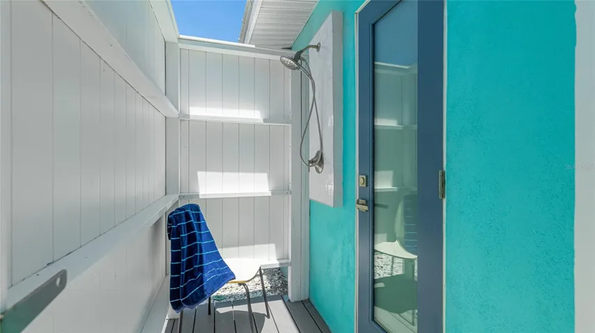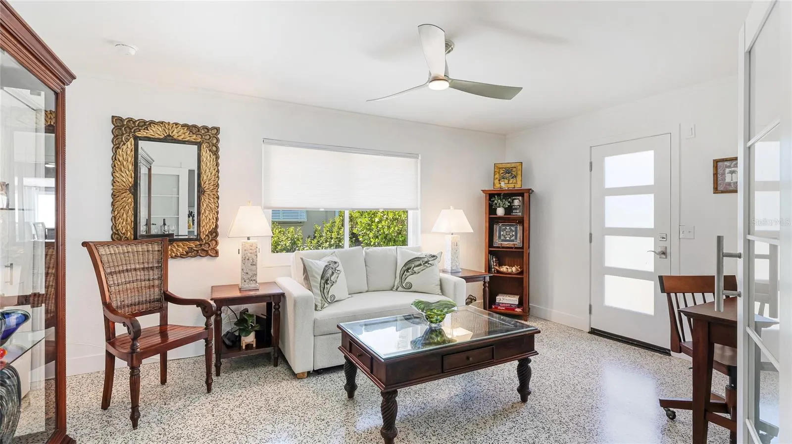Inside, the home offers timeless terrazzo floors and an expanded layout featuring a new approximately 350-square-foot primary suite with a beautifully appointed ensuite bath and both indoor and outdoor showers—ideal for rinsing off after a day at the beach or enjoying a private open-air experience. The newly remodeled kitchen is a showpiece with quartz countertops, stainless steel appliances, and abundant storage, flowing easily between the family room and a flexible third bedroom currently used as a second living area. The primary bedroom has high quality epoxy floors. The laundry room is conveniently located inside but right off the patio for coming in from the beach.