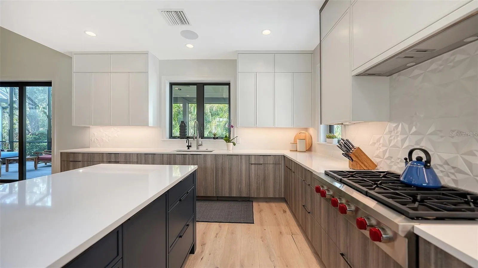 One or more photo(s) has been virtually staged. One or more photo(s) has been virtually staged. Nestled just south of the Ringling Museum, this prestigious West of Trail estate is set in Sarasota’s historic Indian Beach Sapphire Shores neighborhood, known for its majestic tree-canopied streets, bayfront parks, and architectural charm. Spanning 5,712 sq. ft. on a one-half acre lot, this home is designed for multi-generational living, featuring 5 bedrooms, 6.5 baths, 2 offices, and a private in-law suite. A newly built 616 sq. ft. detached guest house with a kitchenette and full bath offers additional flexibility. Extensively remodeled in 2013 and upgraded in 2023 by Murray Homes, the residence boasts a new roof, smart home features, low-voltage lighting, high-end cabinetry, new flooring, an updated kitchen, deck, and lush landscaping. The chef’s kitchen is a showpiece of design and functionality, highlighted by a raised skylight with exposed beam rafters over the 11’8” x 3’7” Cambria White Cliff quartz island with a waterfall mitered end panel and counter-height breakfast bar for five. Soft-close solid wood cabinetry includes pull-out shelves and recessed LED lighting. Top-tier appliances feature a Wolf double oven, Wolf 48” 6-burner gas range, Subzero column refrigerator/freezer, two dishwashers, and an instant hot/cold filtered water faucet. A café nook with a coffee bar and custom cabinetry adds convenience. Designed for seamless indoor-outdoor living, the spacious great room features engineered white oak plank flooring and a floor-to-ceiling walnut slat entertainment wall with a ventless fireplace. A striking agate-topped dry bar with a custom wine bottle display enhances the dining area. The brand-new screened lanai with French white oak Azek decking extends the living space outdoors. The 400 sq. ft. family room provides a flexible retreat, featuring a floating cabinetry entertainment wall, a full pool bath, additional laundry, hidden storage, and a private entrance from the pool deck. Outside, a 2,000 sq. ft. backyard retreat offers a 40 x 15 heated saltwater pool with a cascading waterfall, cooling lime rock pavers, pristine turf, and a brand-new outdoor kitchen with a gas grill and refrigerator. A motorized pergola adjusts for sun or shade, creating a luxurious resort-style setting. The fully fenced yard and lush landscaping enhance the privacy of this location. A brick-paver courtyard and circular driveway add elegance while offering ample parking and space to add an additional garage. This property is not in a flood zone. Minutes from downtown Sarasota, Lido Beach, and St. Armands Circle, the home is perfectly positioned near Ringling College of Art, New College, and the North Trail’s independent restaurants, coffee shops, and pubs.
