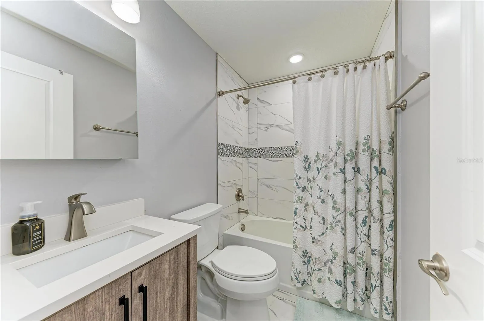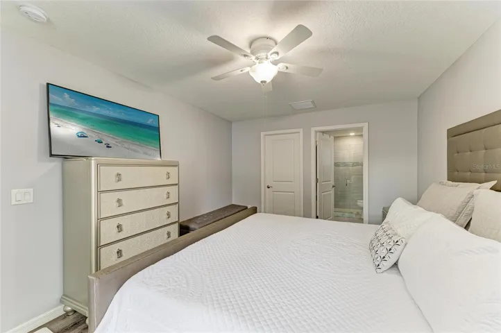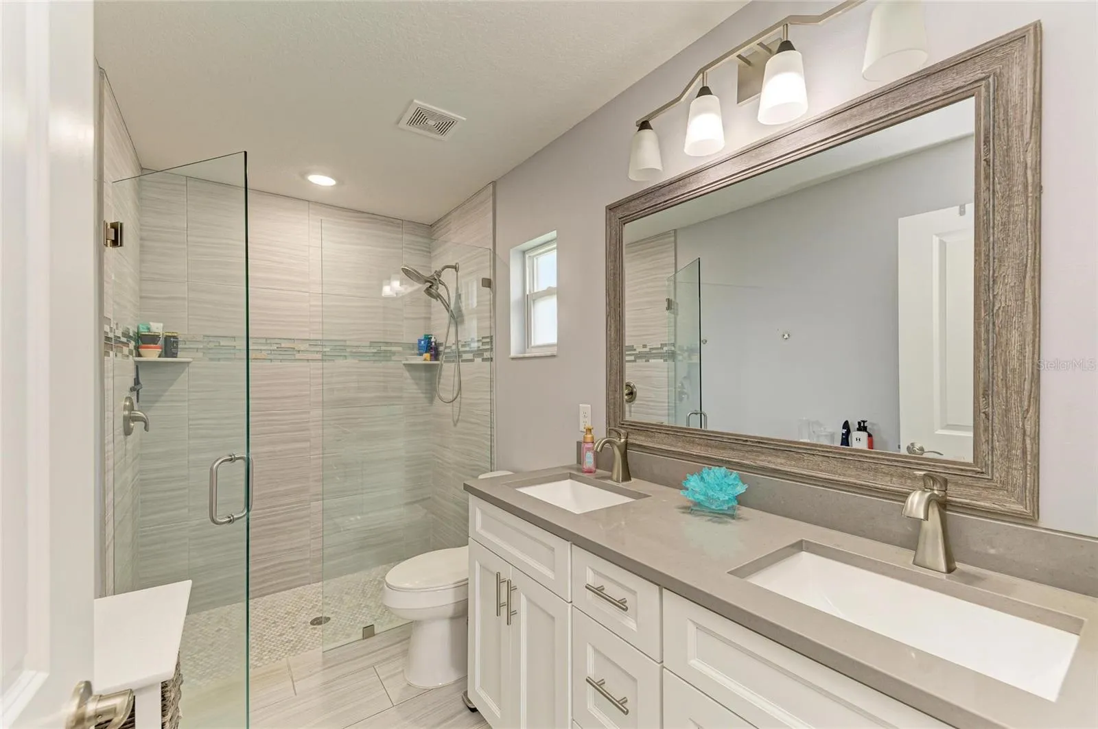 The split floor plan ensures privacy, placing the primary suite on one side of the home as a true retreat. This suite features a large walk-in closet and a spa-like en-suite bathroom with dual sinks, quartz countertops, and a beautifully custom-tiled shower. On the opposite side, the second bedroom includes a built-in closet and enjoys its own adjacent updated bathroom, also adorned with quartz countertops and a custom tile shower.
