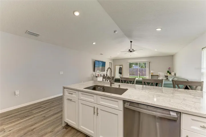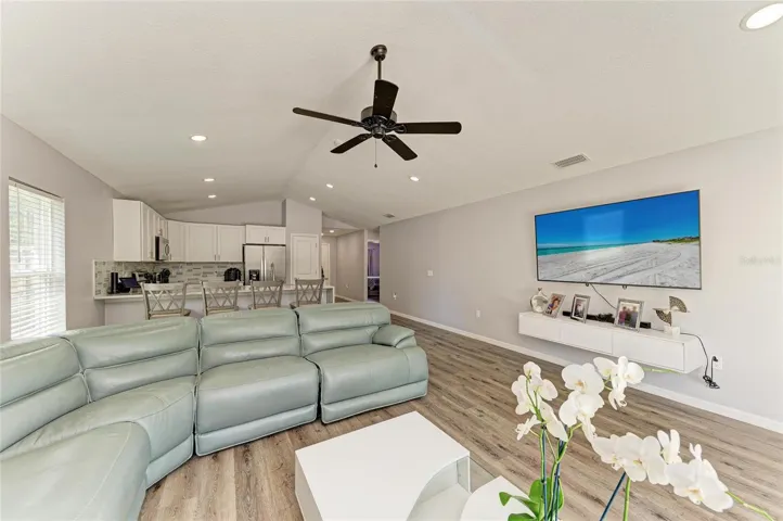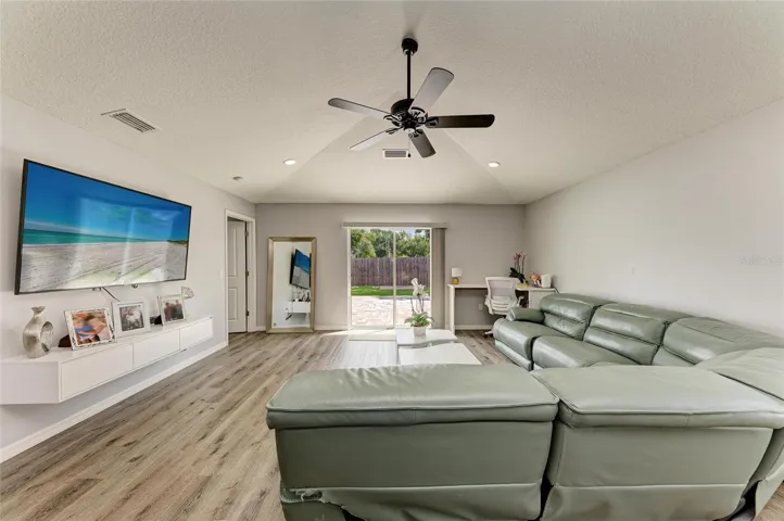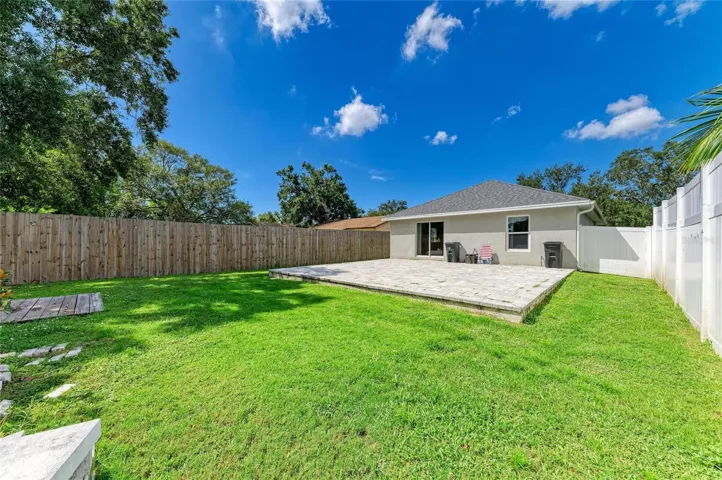 The living space extends outdoors into a spacious fenced backyard, offering endless opportunities for gardening, play, or simply enjoying Florida’s sunshine. Whether you envision weekend barbecues, a play space for family and pets, or even the addition of a future pool, this outdoor area offers endless possibilities for relaxation and recreation.
