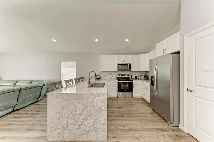 As you step inside, you’ll be greeted by an open-concept design with tall ceilings, creating a light and spacious atmosphere that flows seamlessly throughout the home. The kitchen is the true heart of the home, boasting sleek quartz countertops with waterfall edges, stainless steel appliances, and generous counter space that makes both everyday cooking and entertaining effortless. The adjoining living area offers an easy flow, perfect for family gatherings or cozy evenings at home.