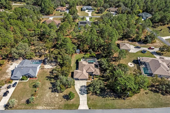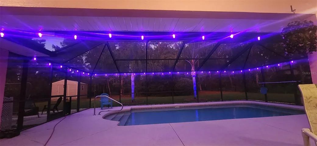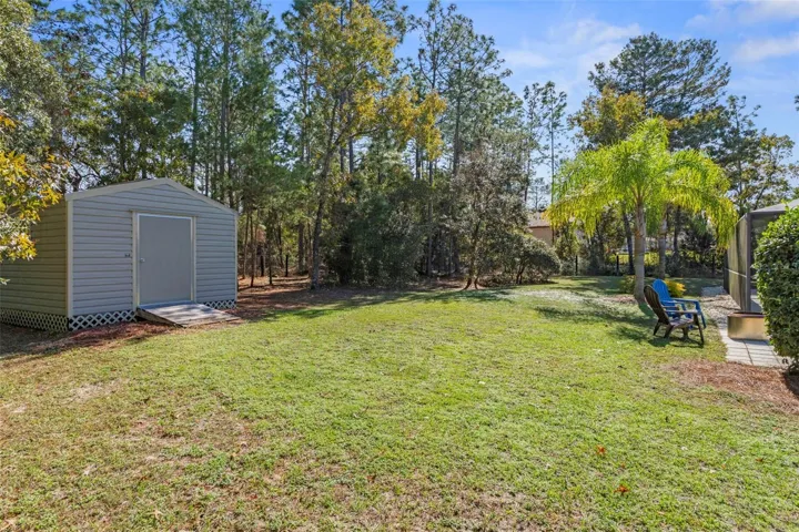 Welcome home to this beautifully maintained 3 bedroom, 2 bath pool home set on 1 full acre in the highly desired Pine Ridge equestrian community. This property blends comfort, function, and Florida living at its finest. Step inside to discover soaring ceilings, 9-ft sliders, abundant natural light, and pool views from most rooms. The inviting great room flows into a thoughtfully upgraded kitchen featuring granite countertops, glass-display cabinets, under-cabinet lighting, breakfast bar, and a sunny eat-in nook overlooking your solar-heated screened pool. The primary suite offers a tray ceiling, private lanai access, dual walk-in closets, and an ensuite bath with a garden tub and separate shower. A split floor plan provides privacy, with two additional bedrooms and a guest bath (with pool access) on the opposite side. Step outside to enjoy true Florida living — a 14×28 screened pool, plus a dedicated patio area ideal for grilling or cozy nights around a fire. The backyard is fully fenced for your four-legged family members and features newly planted palm trees for a tropical touch. Garage Bonus: The 3-car garage features 2 bays converted into a finished music/studio space with mini-split, offering endless flexibility — gym, hobby room, office, or workshop. One bay remains fully functional, and the conversion can be reversed if desired. Please see additional info on garage conversion in the photos! Additional features include a full-home generator with propane tank, interior laundry with sink and storage (washer & dryer included), and a 12×12 storage shed for extra convenience. Major Updates: Roof 2022 | A/C 2018