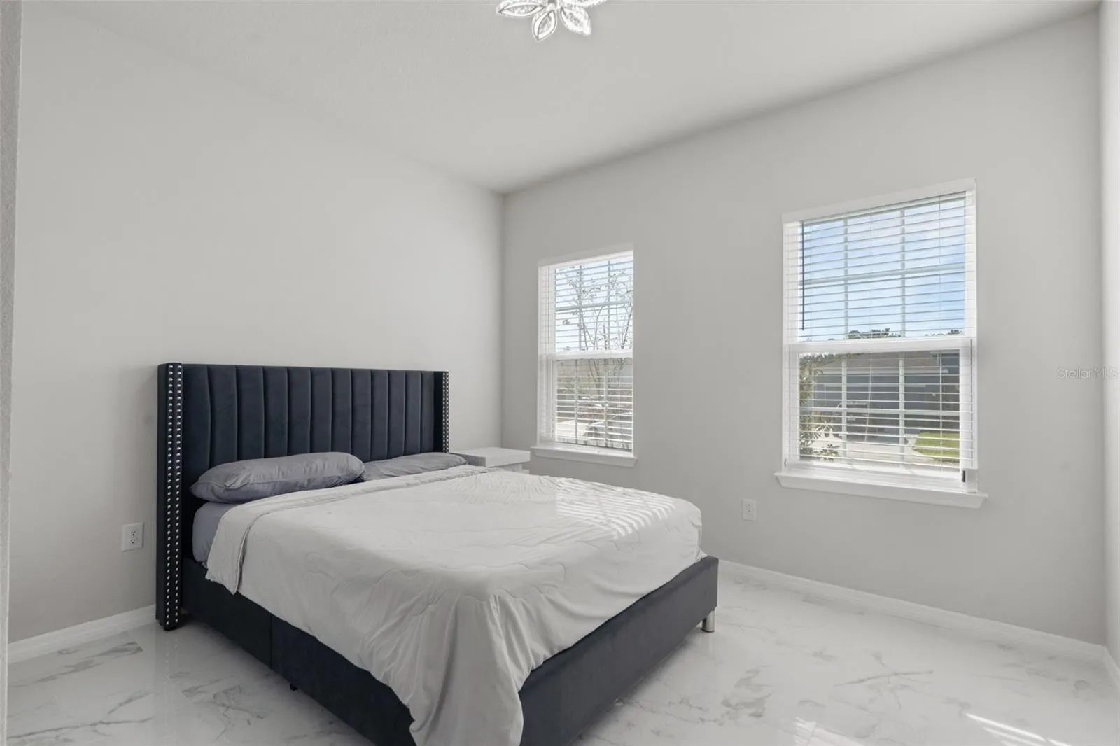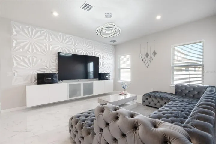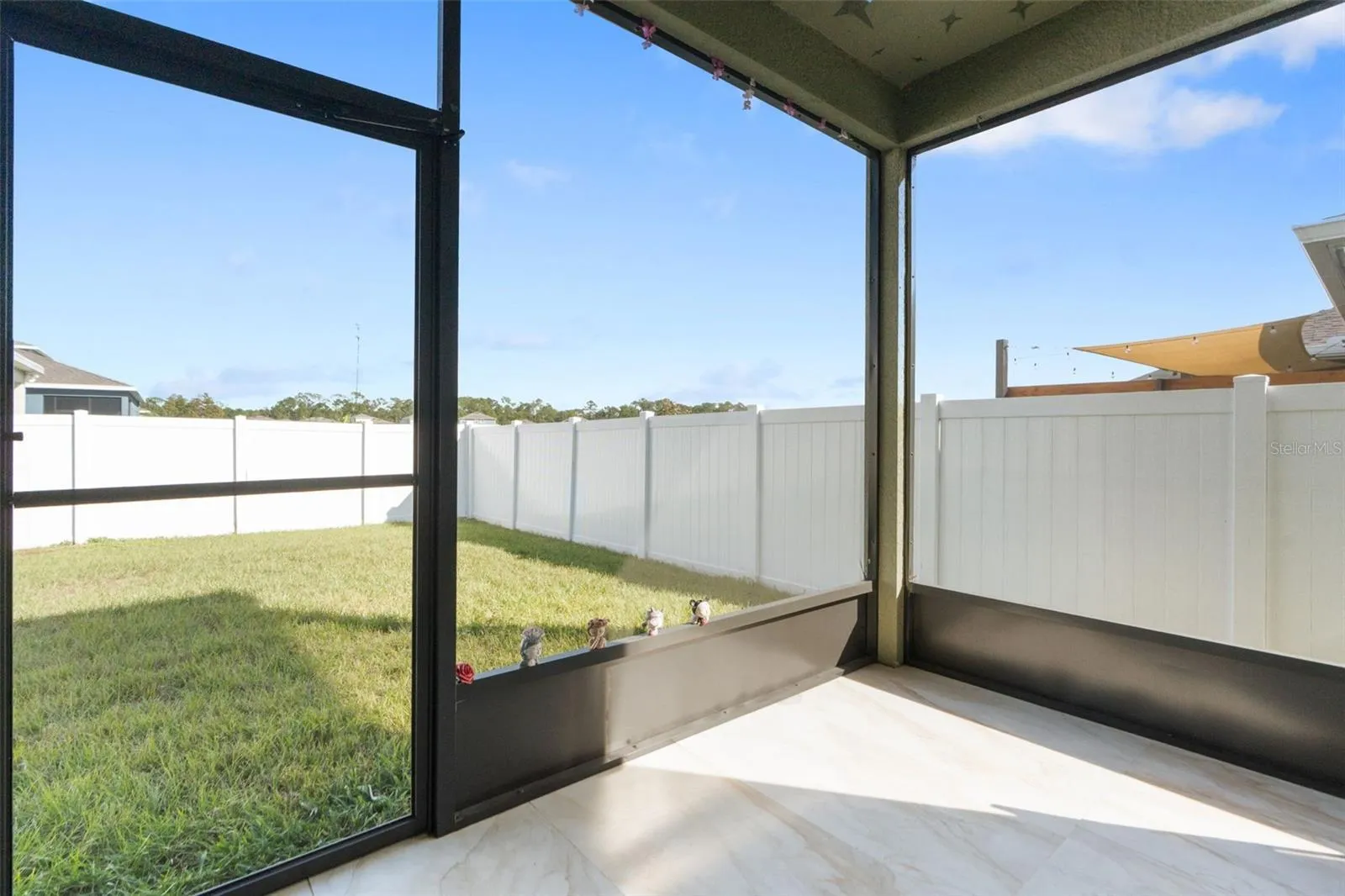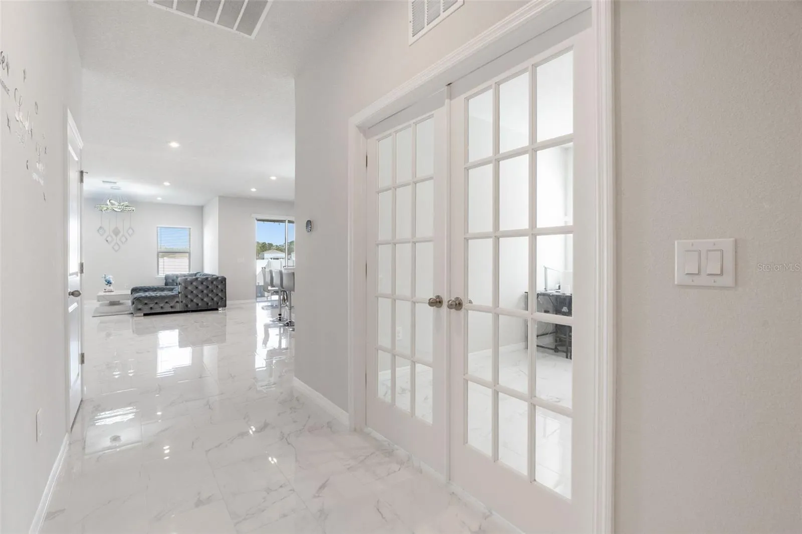 $20,000 PRICE DROP!! Welcome to this 3 bedroom, PLUS office/4th bedroom, 2-bath single-story home built in 2023, in the highly sought-after Park Meadows community. With low HOA fees and No CDD, this home combines modern living with exceptional value & comfort. Through the towering front door you enter a large 7X12 Foyer. You will immediately notice the upgraded porcelain “marble” tile throughout the home, high ceilings and an inviting open floor plan. This is a 3 way split plan, designed for both functionality and privacy. To the right of the foyer is a large 3rd bedroom and a second bathroom with dual vanity, quartz countertops, dark cabinetry and upgraded handles. The tub area has tile all the way up to the ceiling. Next to that is the large office with double french door entry. This would make an excellent 4th bedroom or flex space or keep as an office. To the left is inside laundry room and 2nd bedroom. Continuing through the home is the kitchen, family room dining area combination. The kitchen is a chef’s delight with sleek stainless steel appliances, a spacious walk in pantry, ample cabinet space, and gorgeous Quartz countertops. Enjoy the expansive 9X3 foot island with breakfast bar and seating for 4. There is a large dining space and family room with custom floating entertainment center and designer wall molding. The spacious primary suite offers a large walk-in closet and a spa-inspired bathroom with a walk-in shower as well as his and her sinks with additional space for a vanity station. The extra bathroom includes a tub, duel sinks, and its own spacious linen closet. There is an enclosed screened lanai leading to a partially fenced back yard, The 2-car garage has been upgraded with epoxy flooring to provide durability and a polished finish. Apart from providing exceptional homes, the Park Meadows community also includes a community pool perfect for sunny Florida days and a dedicated dog area for your four-legged friends. This home’s location is unmatched- across from Cypress Creek schools, just 2 miles from the new Johns Hopkins Children’s Hospital, and only 4 miles from the Epperson Lagoon! This move-in ready home offers modern living, fantastic amenities, and a convenient location in one of Wesley Chapel’s most desirable communities — schedule your showing today!