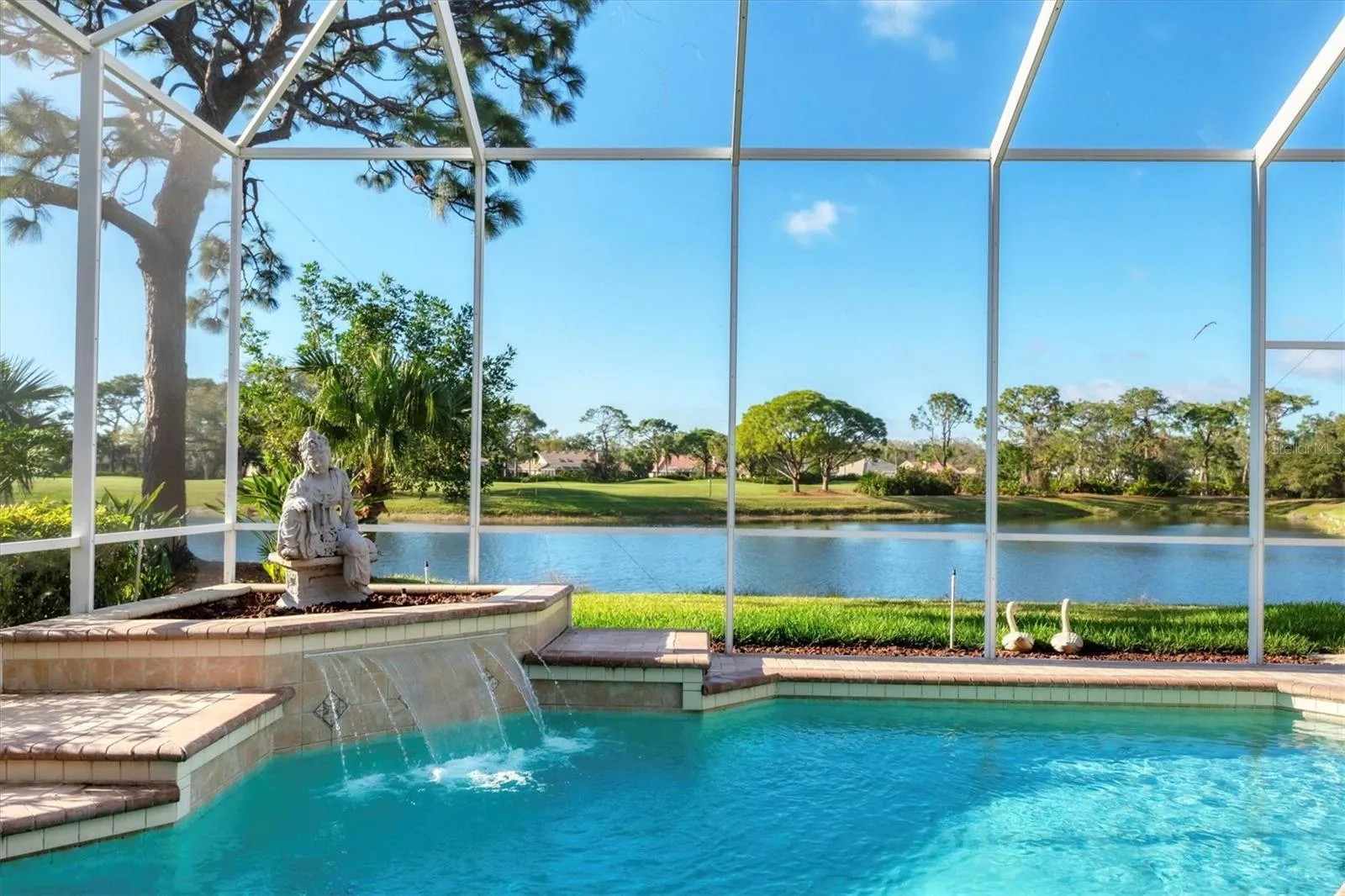 ROOF (2016), AC (2020), WATER HEATER (2020), POOL EQUIPMENT (2020). A rare opportunity to own a home with the best view in the entire country club community, this exquisitely crafted residence by Anchor is set on a premier lot in the prestigious University Park Golf & Country Club. Offering unparalleled lake and golf course views, this stunning home is a masterpiece of classic elegance and refined comfort. Spanning 3,246 square feet, this bright estate offers three bedrooms, three bathrooms, and a private large library with a stunning view of the lake and golf course that can easily serve as a fourth bedroom. Expansive formal and casual living spaces designed for both grand entertaining and everyday luxury. French doors from the primary suite and two sets of 10-foot sliding glass doors from the living and family rooms seamlessly blend indoor and outdoor living, opening to the resort-style pool and lanai with breathtaking views of the serene lake and the second hole of the championship golf course. The primary retreat is a true sanctuary, boasting two oversized walk-in closets, dual vanities, a walk-in glass shower, and a soaking tub. Two additional bedrooms are located on the opposite side of the home, ensuring privacy for guests. The private study or den features a picturesque window framing the exceptional golf and water views. The gourmet kitchen is beautifully appointed with a center island, breakfast bar, an abundance of cabinetry, and generous counter space. For those who prefer to dine out, the Park Grille & Café offers elevated country club dining just moments away. Additional features include a wet bar, volume and tray ceilings, custom built-ins, a paver driveway and lanai, new gutters with leaf filters, and a two-car garage plus a golf cart garage. Location: University Park Country Club. With its mature landscape and sprawling natural beauty, University Park is the premier master-planned community in the Sarasota area. Behind the secured, staffed entrance is an award-winning, resident-owned community featuring 27 holes of four-star rated golf, eleven lighted Har-Tru tennis courts, four pickleball courts, a fitness center, croquet, miles of tree-lined streets for walking or biking, and first-class dining. The community also offers numerous social activities and clubs designed to fit a variety of interests. Located just four miles from downtown Sarasota and its vibrant arts scene, museums, shopping, dining, and first-class healthcare, University Park provides an oasis from the city while keeping all its amenities within easy reach. A short 15-minute drive leads to some of America’s finest beaches, superb outdoor recreation areas—including the internationally renowned Nathan Benderson Park—the famed Ringling Museum, various boating options, and the acclaimed St. Armands Circle. University Park’s breathtaking beauty is unmatched by any other, offering a rare opportunity to own a home in one of Sarasota’s most coveted communities.