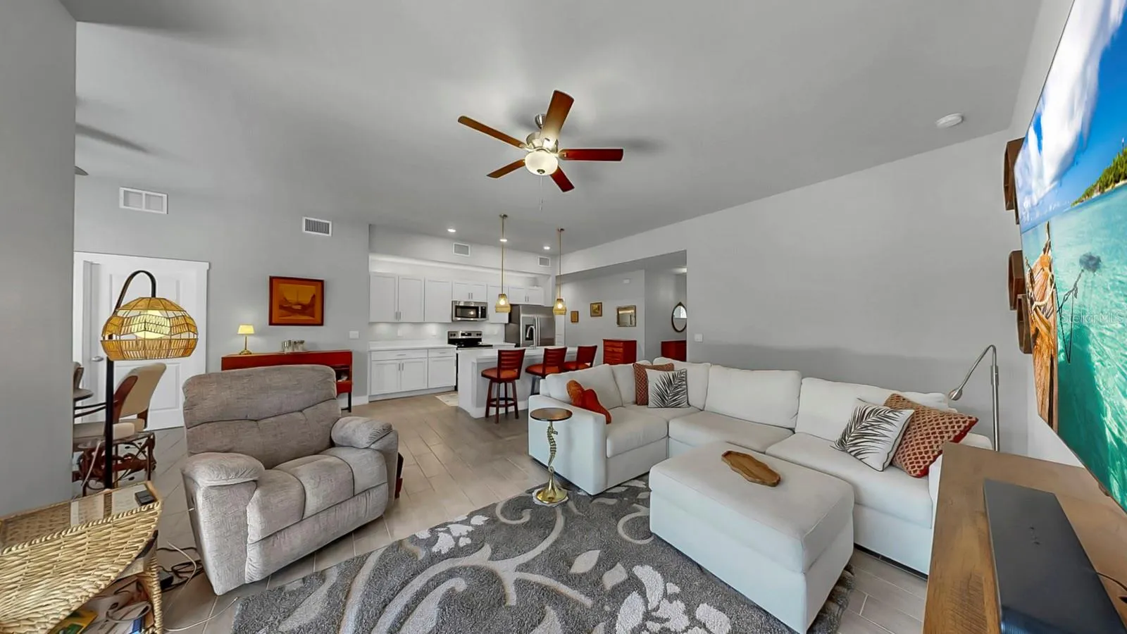 Step inside to discover a bright, open-concept layout where the living room flows seamlessly into the kitchen and dining area. You’ll love the high ceilings, abundant natural light, tile flooring throughout, and ceiling fans in the living area and in every bedroom.