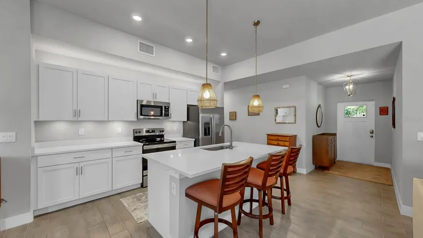 The kitchen is a chef’s delight, featuring white cabinetry, quartz countertops, stainless steel appliances, and a large center island with seating—perfect for casual dining or entertaining. Just off the kitchen, you’ll find an interior laundry room with easy access to the garage. The garage offers built-in ceiling shelving and pull-down attic stairs for additional storage.