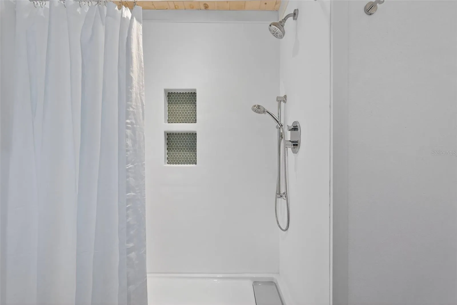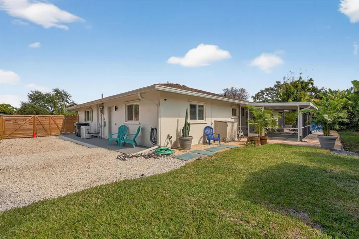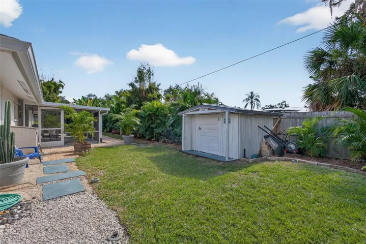 Outdoors, the property unfolds into a lush tropical retreat surrounded by mature privacy landscaping—an intentional “BioShield” mix of Areca palms, bougainvillea, fruiting bananas, dwarf mango, bird of paradise, traveler palms, and clumping bamboo in cypress-mulched beds. The fully fenced backyard includes gated parking for an RV, boat, or trailer; a lockable wooden garden shed with metal roof; a covered well tank enclosure; and an inviting outdoor shower. The paver patio and rescreened lanai (2024) provide ideal spaces to relax and entertain, enhanced by landscape lighting with Wi-Fi smart control.