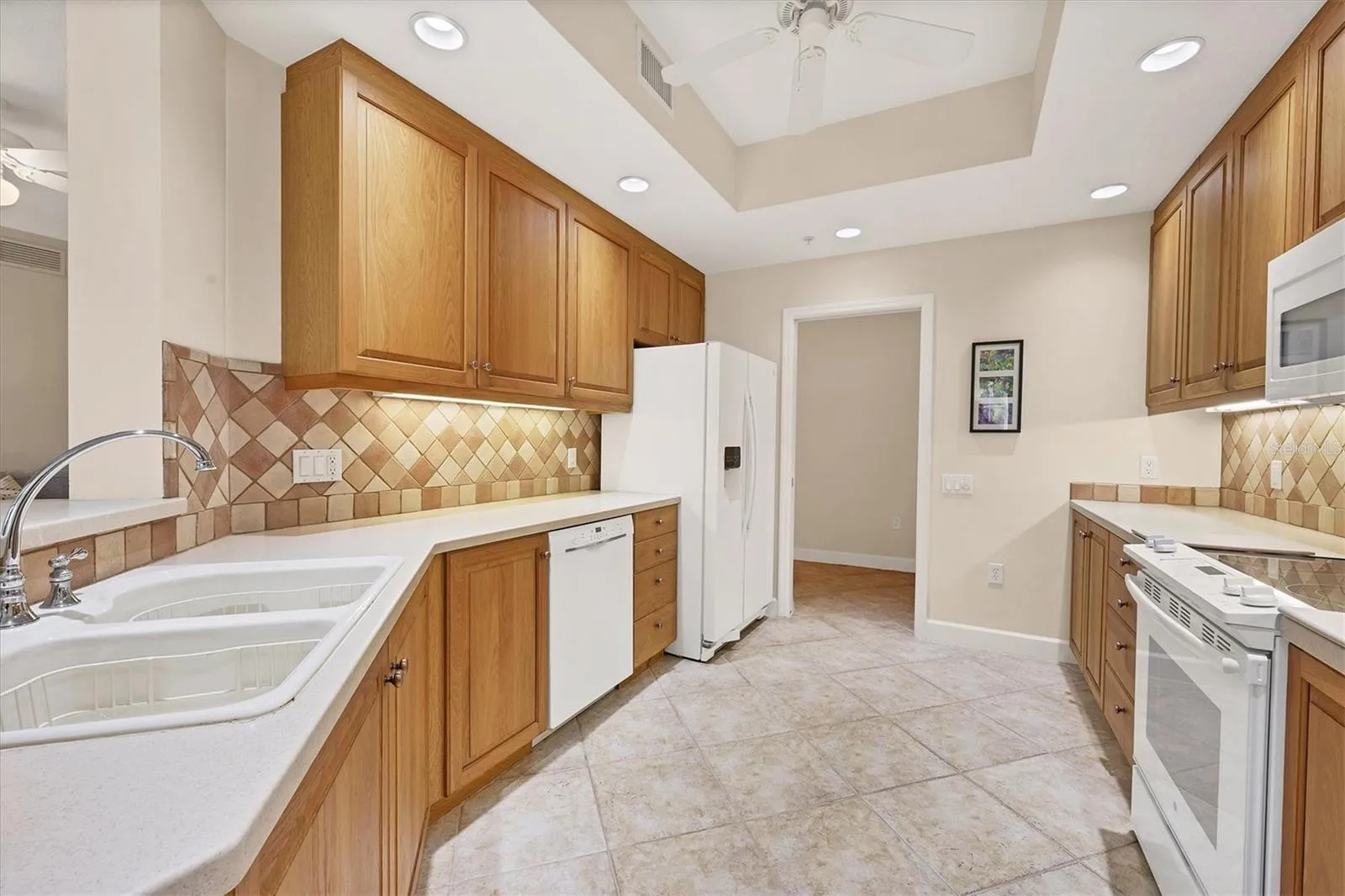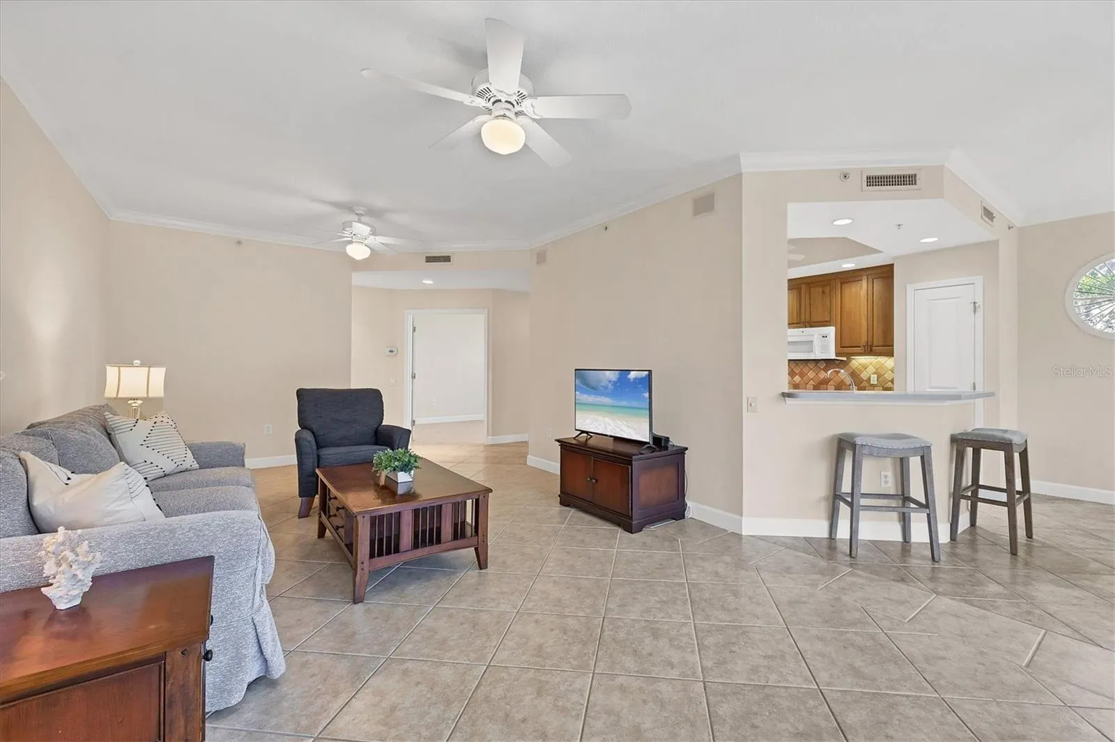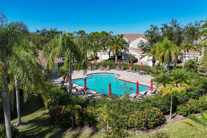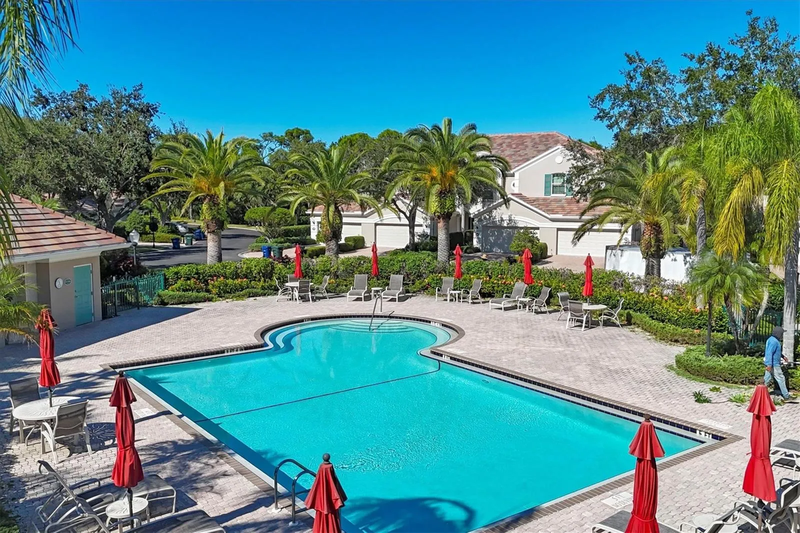 Spectacular lake and fountain views from this first floor, end unit in the highly desirable maintenance free, gated community of Botanica on Palmer Ranch! This is a well built home with solid core doors, high ceilings, crown molding and plantation shutters. The kitchen features solid surface countertops, classic tile backsplash and tall cabinets, plus a bar counter for extra eating space. Primary bedroom includes two walk in closets and a relaxing lake view. Beautifully updated primary en suite bath with walk in shower and dual sink vanities with gorgeous quartz countertops! Diagonal, neutral tile flows through all main living areas and continues through the double doors into the office/third bedroom. This unit has ELECTRONIC HURRICANE SHUTTERS on the lanai, offering extra security and peace of mind. Additional features include an inside laundry room and a garage, all offered at a fantastic price! HOA includes all exterior maintenance (building and lawn), pest control and cable TV. ** NEW TILE ROOFS 2023, EXTERIOR PAINT 2024, WHOLE HOUSE WATER FILTER** Botanica offers resort-style amenities with two heated pools, fitness center, clubhouse, meeting rooms, catering kitchen, library and outdoor entertainment areas. Conveniently located on Palmer Ranch, only minutes from shopping, entertainment, the Legacy Trail and a 15 minute drive from the world-famous Siesta Key Beach. Whether you are here year-round or seasonally, this home offers an effortless way to enjoy the Florida lifestyle in comfort and style.