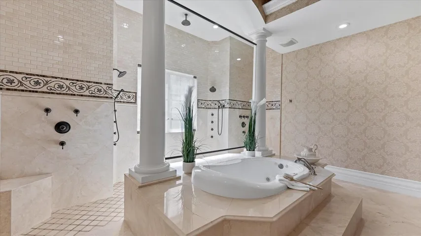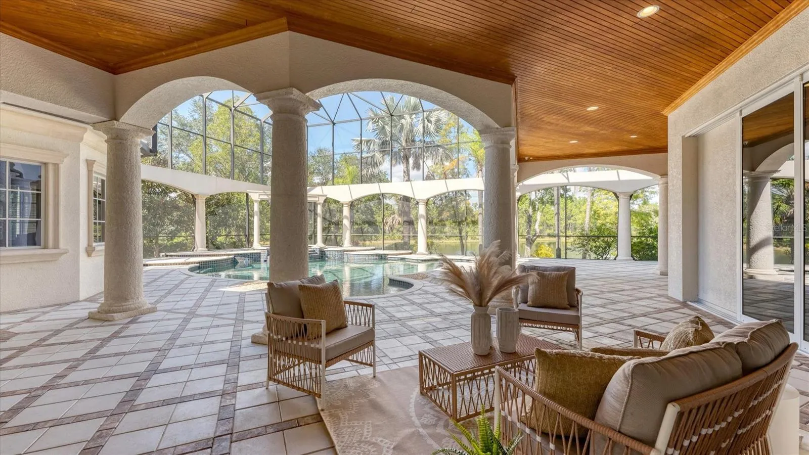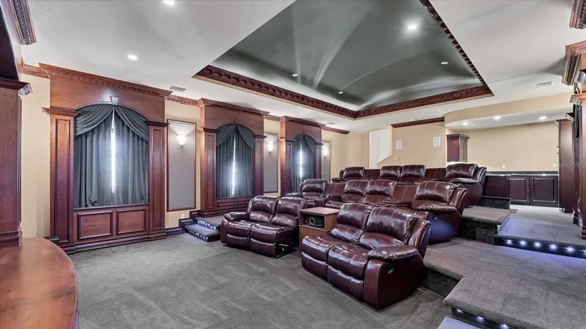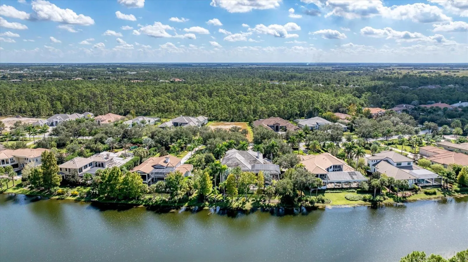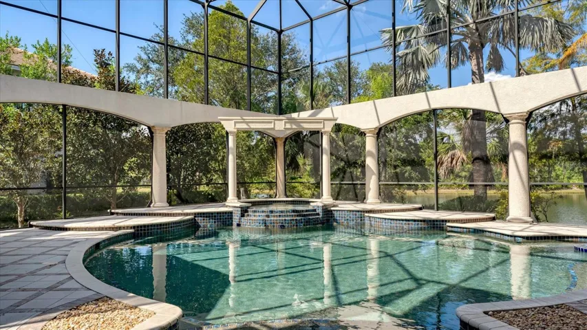 Experience iconic luxury living in The Concession! This former St. Andrews showcase model by Pruett Builders is a masterful display of craftsmanship and grandeur, on a private .78-acre lakefront homesite in The Concession, one of the region’s exclusive, championship golf communities. A circular paver driveway with a centerpiece fountain and lush landscaping creates an unforgettable arrival. Double doors open into a dramatic foyer where a striking onyx medallion inlaid into rectified travertine sets the tone for the home’s opulence. Palatial columns, intricate ceiling designs, rich moldings and elegant fixtures elevate every space. The 26-foot ceilings in the living room are accentuated by an Emperador marble fireplace, aquarium glass windows and a graceful curved wet bar with wine cellar, designed to impress while seamlessly servicing the grand dining room and adjacent entertaining area. The gourmet kitchen is a chef’s dream, featuring custom cabinetry, a Wolf double range with six burners, griddle and grill, Sub-Zero paneled refrigerator/freezer, hammered copper farmhouse sink, dual dishwashers, expansive hidden pantry and island with prep sink. A great room and breakfast nook flow effortlessly from this culinary space. The first-floor primary suite is a private retreat with pool views, raised sitting area, morning bar, and lanai access. The spa-inspired bath boasts a Jacuzzi tub, dual-entry Roman shower with five showerheads, dual water closets, and an extraordinary 9-by-31-foot boutique-style custom closet with glass display cabinetry. An additional large guest suite with built-ins is on the main level. Upstairs, an elevator or sweeping curved staircase with iron details leads to a vast loft that serves as recreation and billiards area, complete with a wet bar, refrigerator, microwave and drawer dishwasher. Three additional en suite guest suites with custom walk-in closets, a multipurpose office/bonus room, and access to the sweeping balcony with panoramic lake views complete the upper level. Entertain in style inside the 12-seat theater with recliners, projector, wet bar, cooler and microwave. Outdoor living is equally impressive with a screened saltwater Pentair heated pool and spa featuring a columned waterfall and sun shelf, outdoor kitchen, and expansive covered lounging areas. Additional highlights include two offices, one with elegant wood flooring and abundant natural light, and the other with built-in desks, two laundry rooms, two powder rooms, every closet fully customized and four-car side-load garage. In The Concession, home to a renowned 18-hole championship course, Jack Nicklaus-designed par-3 course, golf training facility, and host of prestigious PGA tournaments including the 2021 World Golf Championship, 2023 World Champions Cup, and Senior PGA Championship for three consecutive years beginning in 2026. Club members enjoy dining at The Bistro, sipping a cocktail at the Bistro Bar, or accommodating guests at on-site luxury lodges and casitas. Positioned off University Parkway, this home offers effortless access to UTC Mall, vibrant Waterside Place, Sarasota Polo Club, premier shopping, exceptional dining, and local attractions like the Mote SEA Aquarium. Enjoy quick commutes to downtown Sarasota with its renowned arts, culture and pristine Gulf beaches. Don’t miss your chance to own this exceptional property in the nation’s top-selling, multigenerational, planned community.