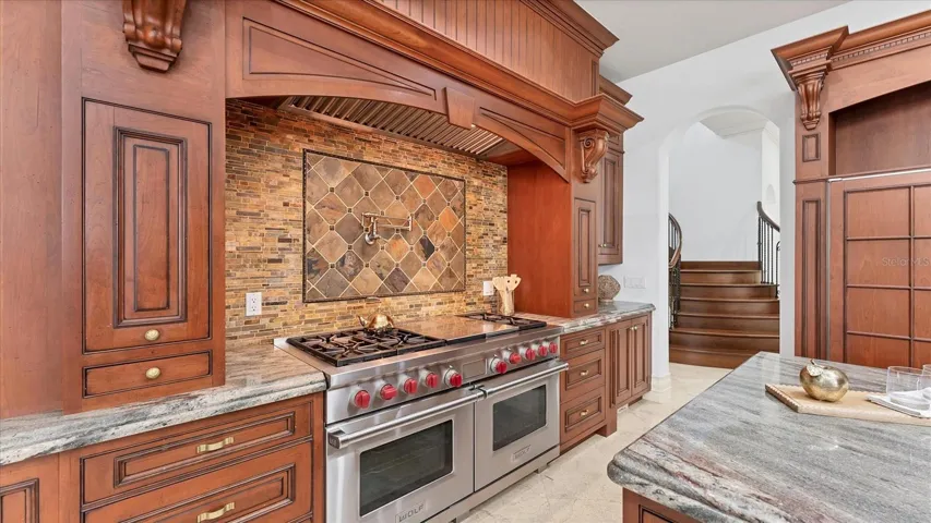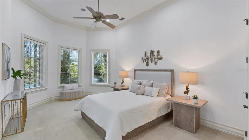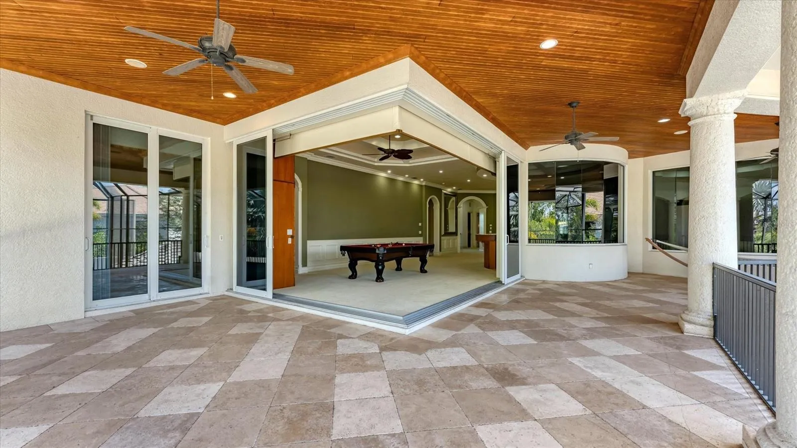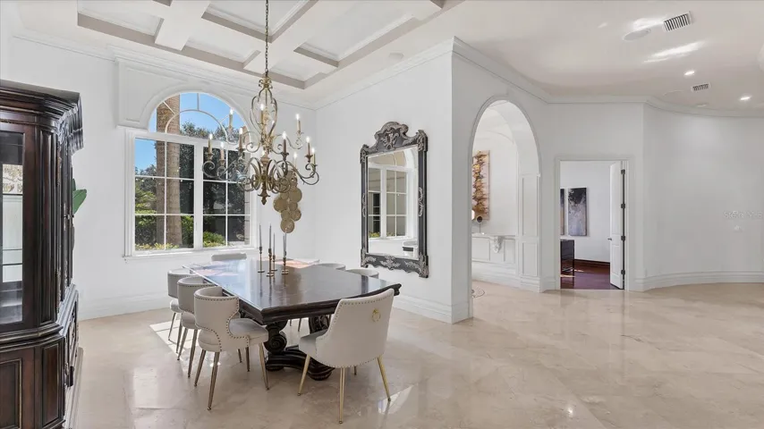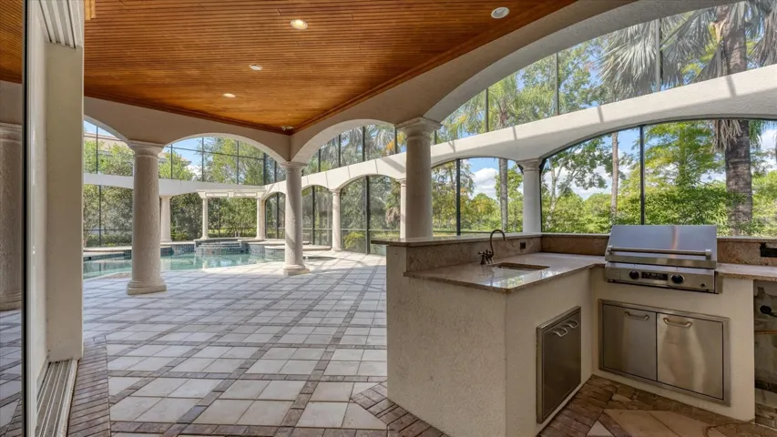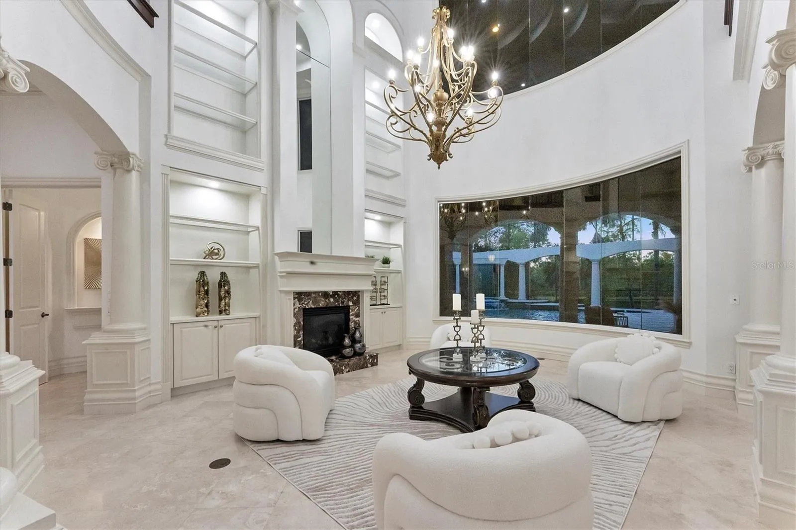 Experience iconic luxury living in The Concession! This former St. Andrews showcase model by Pruett Builders is a masterful display of craftsmanship and grandeur, on a private .78-acre lakefront homesite in The Concession, one of the region’s exclusive, championship golf communities. A circular paver driveway with a centerpiece fountain and lush landscaping creates an unforgettable arrival. Double doors open into a dramatic foyer where a striking onyx medallion inlaid into rectified travertine sets the tone for the home’s opulence. Palatial columns, intricate ceiling designs, rich moldings and elegant fixtures elevate every space. The 26-foot ceilings in the living room are accentuated by an Emperador marble fireplace, aquarium glass windows and a graceful curved wet bar with wine cellar, designed to impress while seamlessly servicing the grand dining room and adjacent entertaining area. The gourmet kitchen is a chef’s dream, featuring custom cabinetry, a Wolf double range with six burners, griddle and grill, Sub-Zero paneled refrigerator/freezer, hammered copper farmhouse sink, dual dishwashers, expansive hidden pantry and island with prep sink. A great room and breakfast nook flow effortlessly from this culinary space. The first-floor primary suite is a private retreat with pool views, raised sitting area, morning bar, and lanai access. The spa-inspired bath boasts a Jacuzzi tub, dual-entry Roman shower with five showerheads, dual water closets, and an extraordinary 9-by-31-foot boutique-style custom closet with glass display cabinetry. An additional large guest suite with built-ins is on the main level. Upstairs, an elevator or sweeping curved staircase with iron details leads to a vast loft that serves as recreation and billiards area, complete with a wet bar, refrigerator, microwave and drawer dishwasher. Three additional en suite guest suites with custom walk-in closets, a multipurpose office/bonus room, and access to the sweeping balcony with panoramic lake views complete the upper level. Entertain in style inside the 12-seat theater with recliners, projector, wet bar, cooler and microwave. Outdoor living is equally impressive with a screened saltwater Pentair heated pool and spa featuring a columned waterfall and sun shelf, outdoor kitchen, and expansive covered lounging areas. Additional highlights include two offices, one with elegant wood flooring and abundant natural light, and the other with built-in desks, two laundry rooms, two powder rooms, every closet fully customized and four-car side-load garage. In The Concession, home to a renowned 18-hole championship course, Jack Nicklaus-designed par-3 course, golf training facility, and host of prestigious PGA tournaments including the 2021 World Golf Championship, 2023 World Champions Cup, and Senior PGA Championship for three consecutive years beginning in 2026. Club members enjoy dining at The Bistro, sipping a cocktail at the Bistro Bar, or accommodating guests at on-site luxury lodges and casitas. Positioned off University Parkway, this home offers effortless access to UTC Mall, vibrant Waterside Place, Sarasota Polo Club, premier shopping, exceptional dining, and local attractions like the Mote SEA Aquarium. Enjoy quick commutes to downtown Sarasota with its renowned arts, culture and pristine Gulf beaches. Don’t miss your chance to own this exceptional property in the nation’s top-selling, multigenerational, planned community.