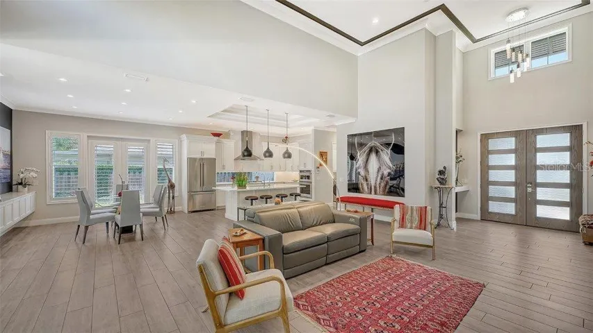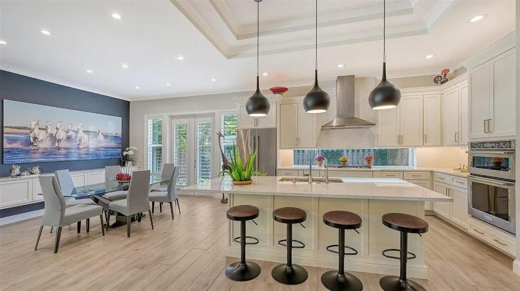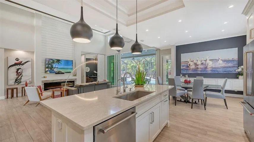 An exceptional single-story Allegra home in Sarasota’s coveted West of Trail Flower Streets, perfectly positioned within the Southside School district and just steps from the charming Southside Village restaurants, shops, and Morton’s Gourmet Market. This impeccably designed 3-bedroom + office + bonus room, 2.5-bathroom home epitomizes modern coastal living and showcases the esteemed Kristi Ann single story floor plan, offering a seamless blend of sophisticated design and everyday functionality, making it an ideal primary or seasonal residence. From the moment you step through the double doors, you’ll be captivated by the open and inviting main living space. The soaring 18-foot ceiling and wall of expansive 10-foot pocketing sliders draw you towards the resort-like outdoor retreat, perfect for relaxing or entertaining. The living room is a true architectural masterpiece, featuring a dramatic floating tray ceiling with Halo-LED lighting and a focal wall complete with a remote-controlled electric fireplace. The chef’s kitchen is as functional as it is stylish, equipped with stainless steel appliances, a 5-burner gas range, Quartz island and countertops, and a generous walk-in pantry. The dining area, both intimate and elegant, includes a built-in Quartz-topped buffet, creating a serene space for family meals or hosting guests. The primary suite offers a tranquil escape, with vaulted ceiling accented by charming wood beams. The spacious custom walk-in closet ensures ample storage, while the spa-like en-suite bathroom, featuring glass-enclosed shower and designer tile, is the perfect respite after a long day. Two additional large guest bedrooms, along with a well-appointed guest bathroom and powder room, offer comfort and privacy for family or visitors. This award-winning floorplan also boasts a dedicated office, versatile bonus room, laundry room, and a 2-car garage with added storage, meeting the needs of modern living. Step outside and discover an expansive lanai with a resort-style heated pool, spa, and impressive summer kitchen, all surrounded by lush landscaping and illuminated by custom lighting. The disappearing corner sliders seamlessly blend indoor and outdoor spaces, offering the quintessential Sarasota lifestyle. This home is packed with custom features, including designer lighting and built-ins, PGT impact windows, solid-core interior doors, and spray foam insulation for optimal energy efficiency. Recent upgrades include remote-controlled Kevlar shades for additional hurricane protection/storage for outside furnishings/sunshade, new AC unit with UV lights, 2023 mini split AC unit in the garage, and a whole-home in-duct air purifier, ensuring comfort and peace of mind. This impeccably crafted residence captures the essence of Southside Village living, offering a single-level floor plan that balances everyday comfort with refined style. Ideally positioned near Southside School, Sarasota Memorial Hospital, Downtown Sarasota, and Siesta Key Beach, it delivers the ultimate blend of location, luxury, and lifestyle. Built to the latest hurricane codes and outside the flood zone, the home provides peace of mind along with timeless design. Every detail has been thoughtfully curated, creating an exceptional opportunity for discerning buyers to experience the best of Sarasota living in a true single-story gem.
