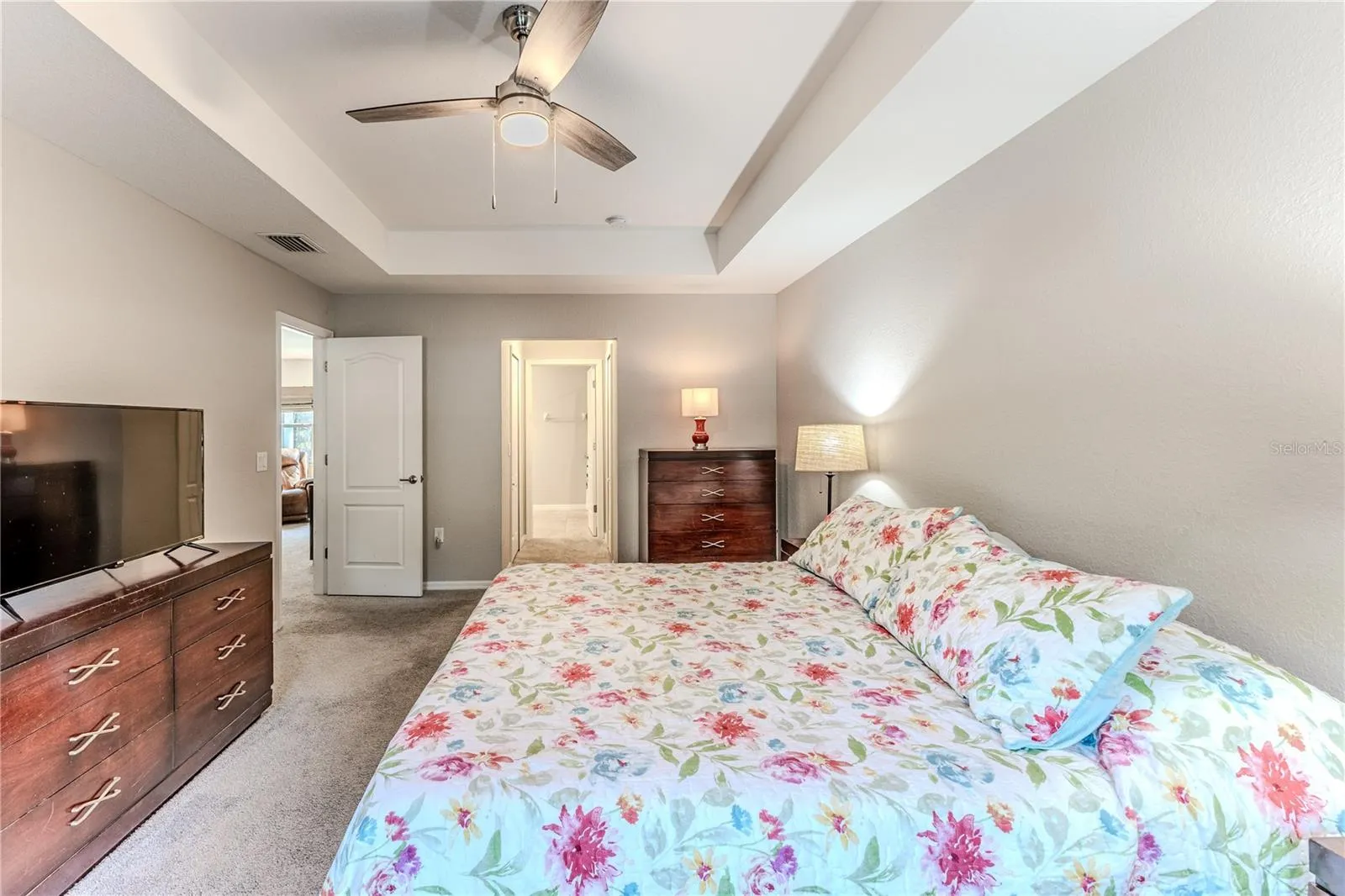 A charming front garden and glass front door set the tone as you enter into the bright and open great room featuring vaulted ceilings and a seamless flow between the living room, dining area, and kitchen. Just off the living area, you’ll find a dedicated office behind elegant glass French doors. The spacious main bedroom includes tray ceilings, two large walk-in closets, and an en suite bathroom with tile flooring, dual-sink vanity, and a beautiful snail shower. The kitchen offers a large island with double stainless-steel sink, stainless-steel appliances, wood cabinetry, and two pantries. Sliding doors lead to a covered lanai with a ceiling fan—perfect for relaxing outdoors.